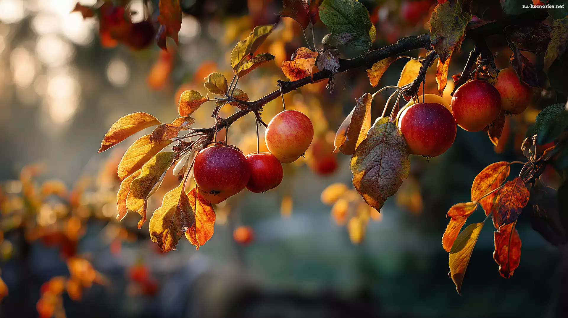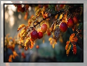 Liście, Czerwone, Jesienne, Grafika AI, Gałązka, Jabłka na Komórkę