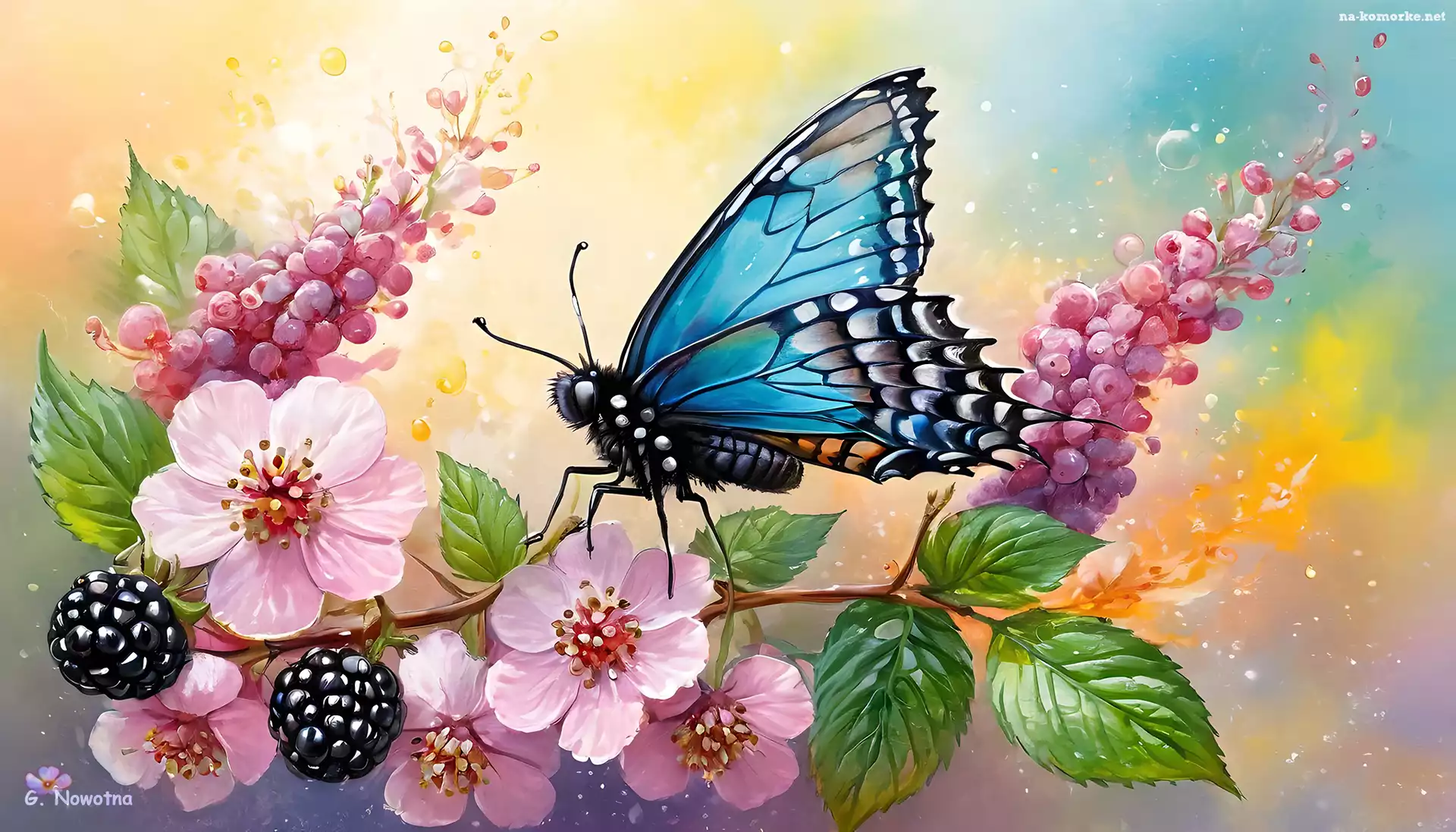 Niebieski, Motyl, Jeżyny, Grafika, Kwiaty, Liście, Różowe na Komórkę