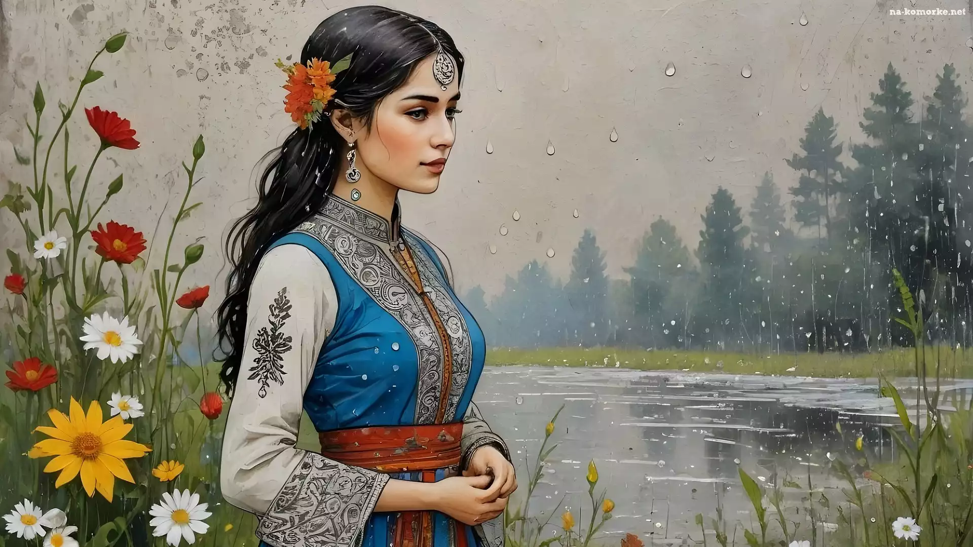 Drzewa, Deszcz, Kobieta, Grafika, Rzeka, Kwiaty, Brunetka na Komórkę