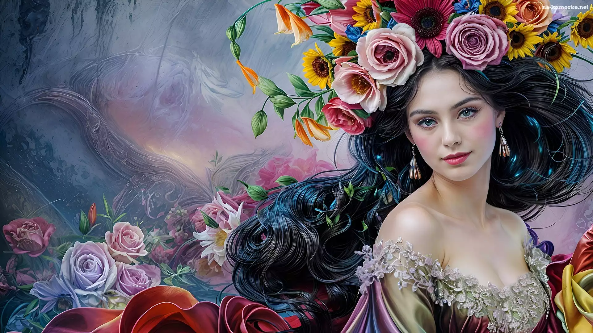 Wianek, Dziewczyna, Kwiaty, Grafika, Brunetka, Kobieta na Komórkę