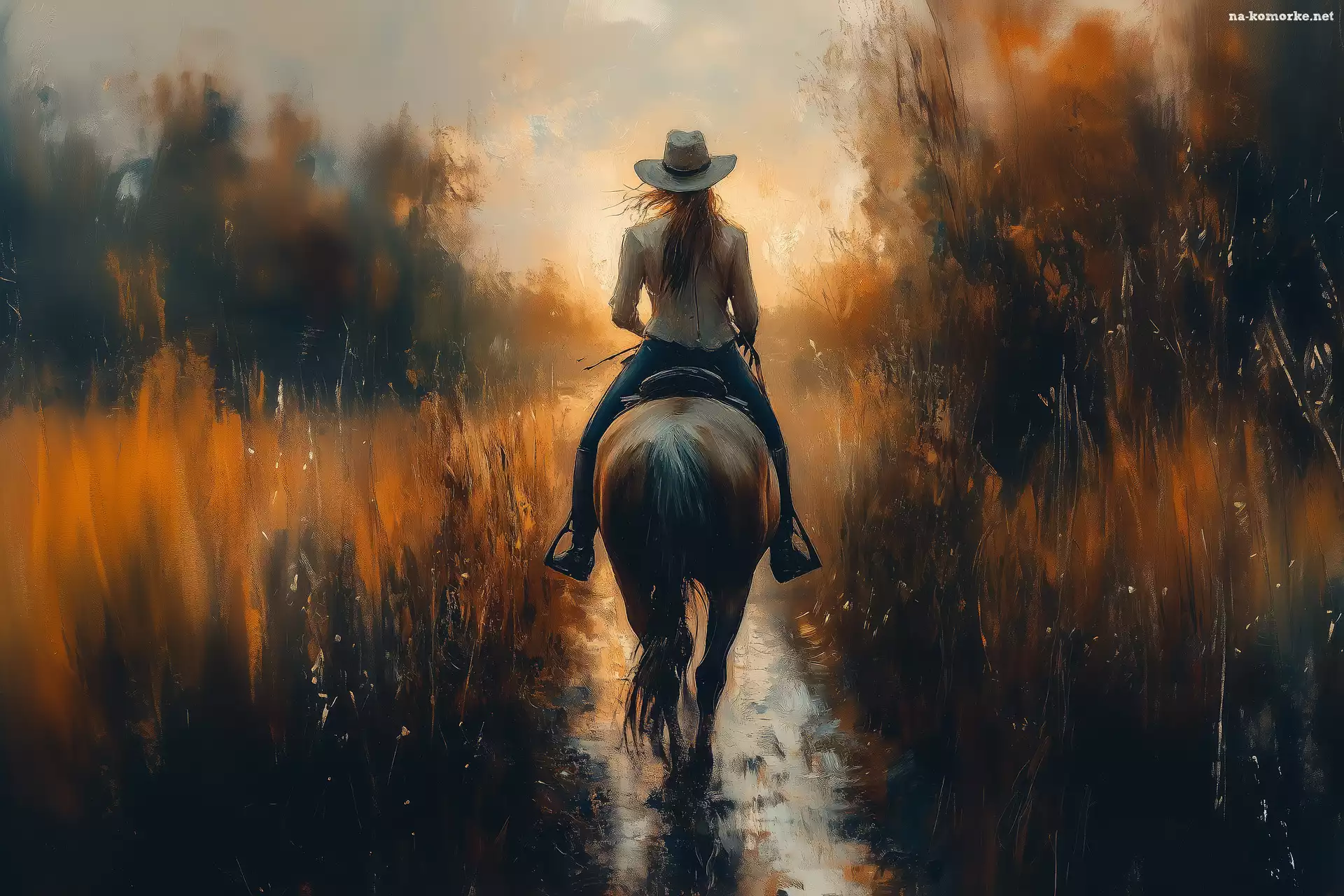 Trawa, Kobieta, Las, Grafika, Jesień, Koń na Komórkę