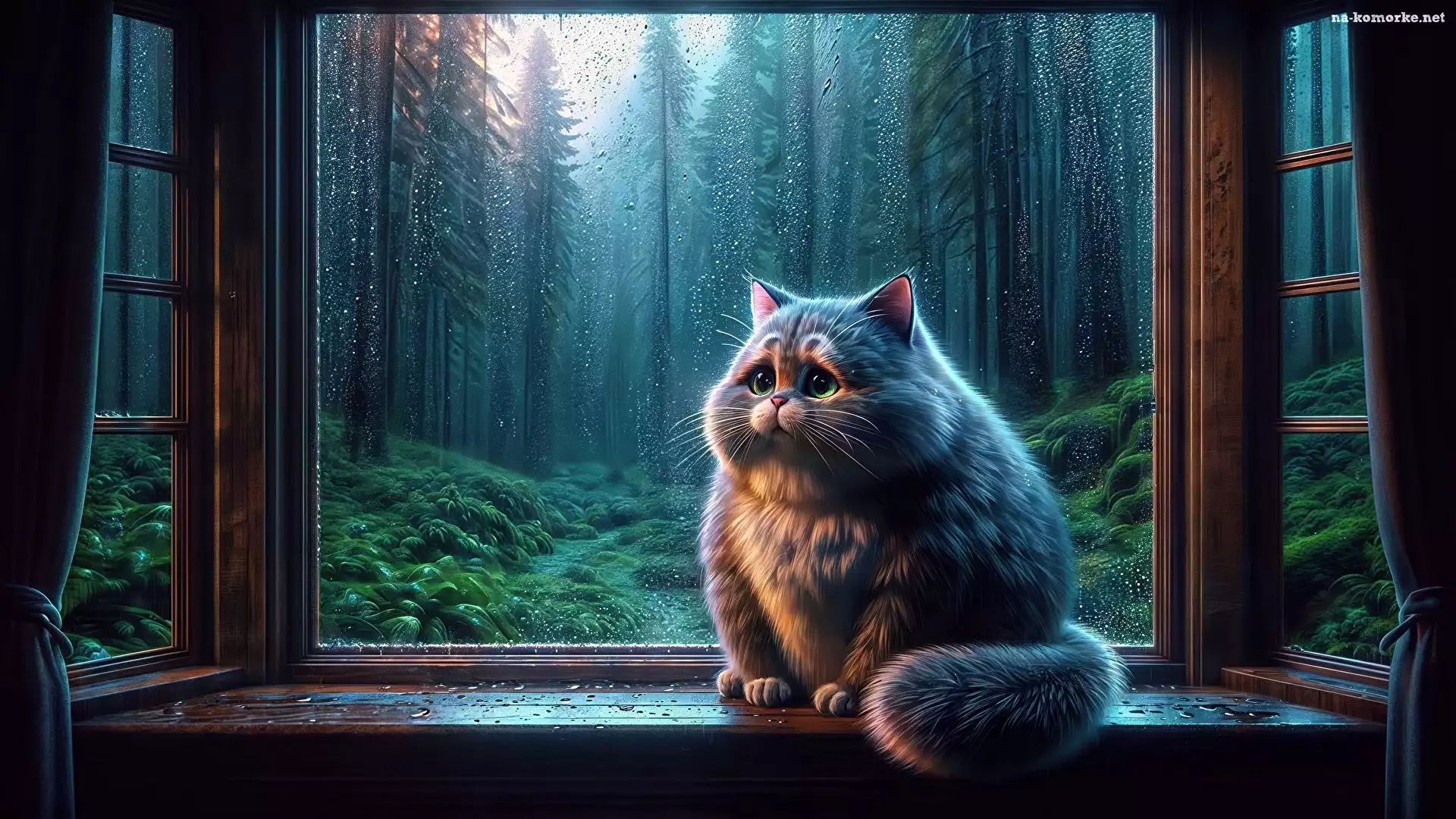 Deszcz, Drzewa, Kot, Grafika, Smutny, Okno, Puszysty na Komórkę