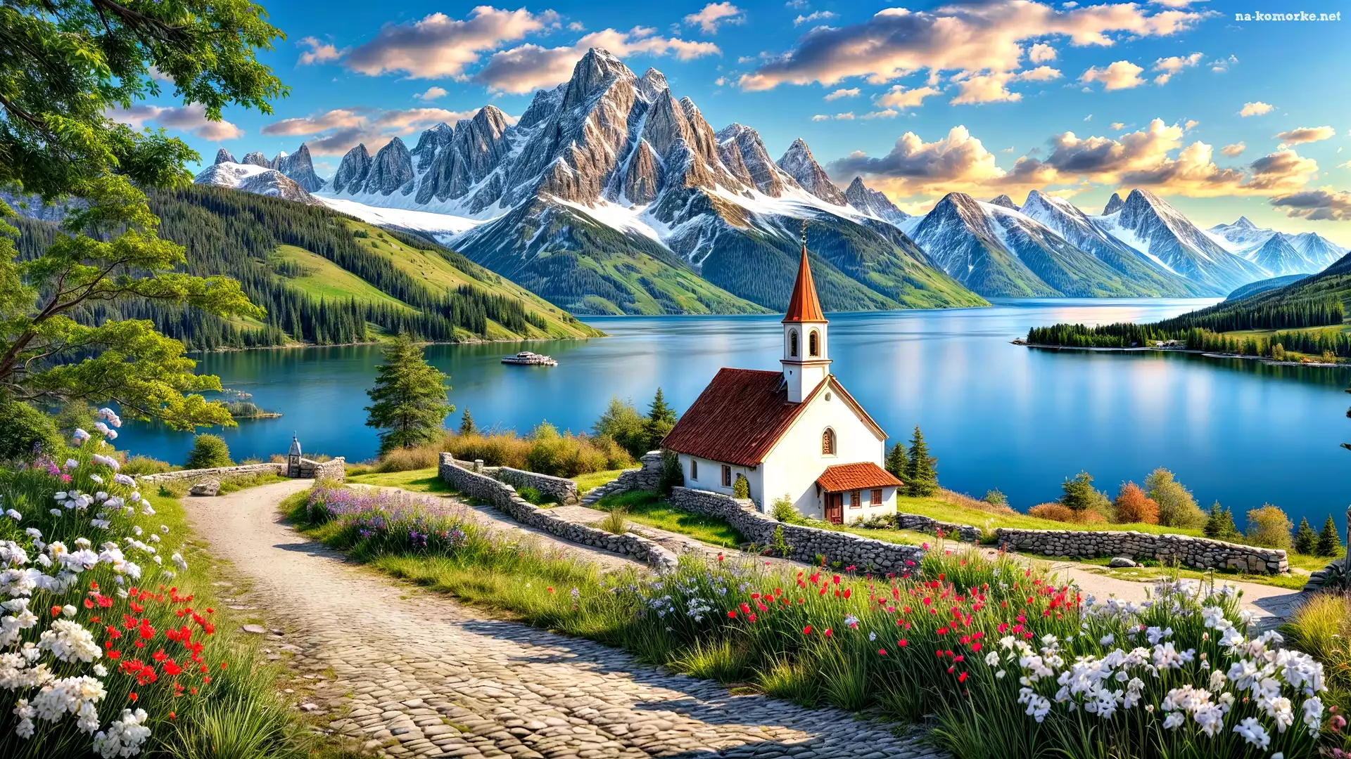 Góry, Droga, Jezioro, Grafika, Kościół, Kwiaty na Komórkę