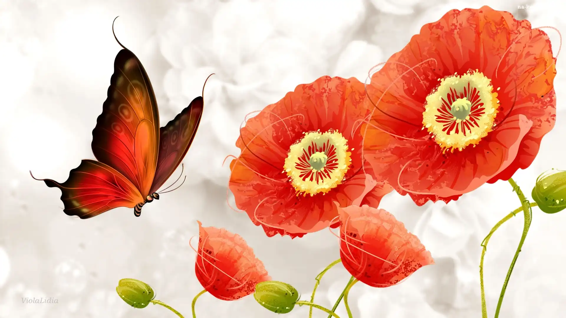 Grafika, Motyl, Kwiaty, Maki na Komórkę