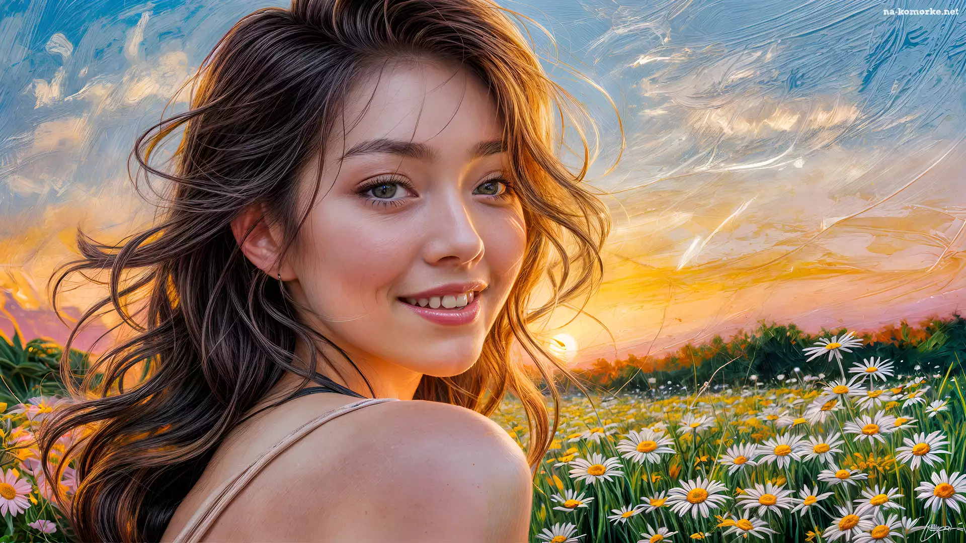 Słońce, Dziewczyna, Kwiaty, Grafika, Białe, Łąka na Komórkę