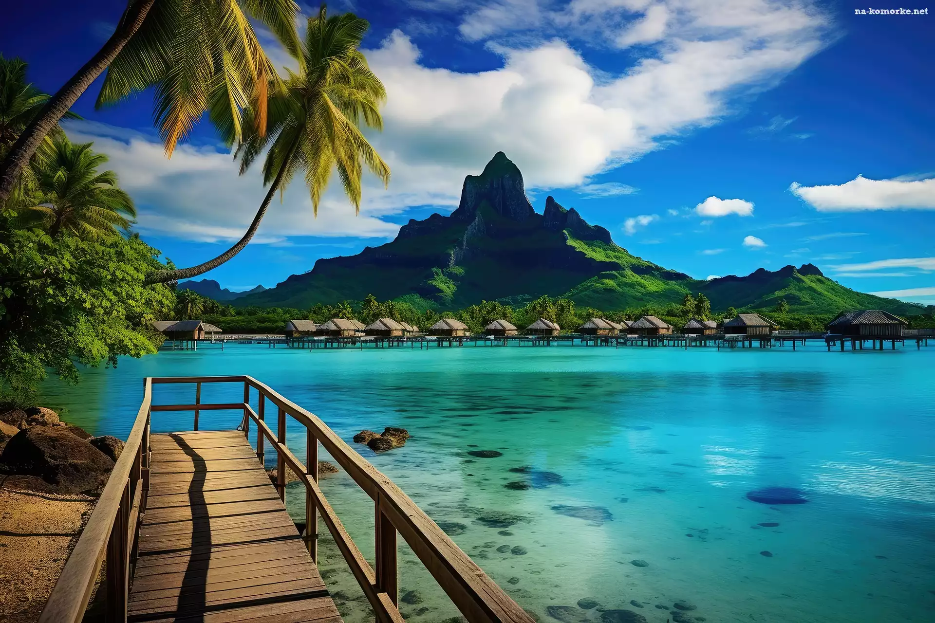 Bungalowy, Góry, Morze, Grafika, Palmy, Domy, Pomost na Komórkę
