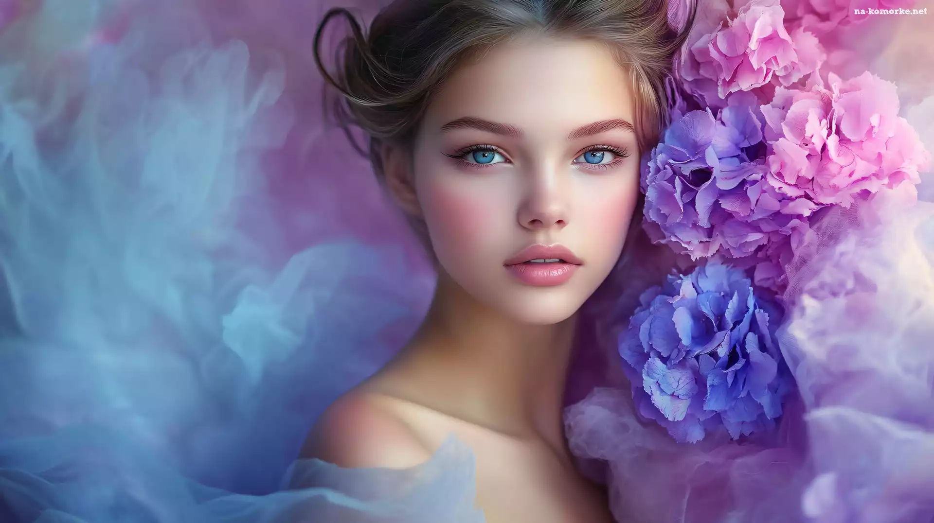 Hortensje, Dziewczyna, Kwiaty, Grafika, Oczy, Niebieskie na Komórkę