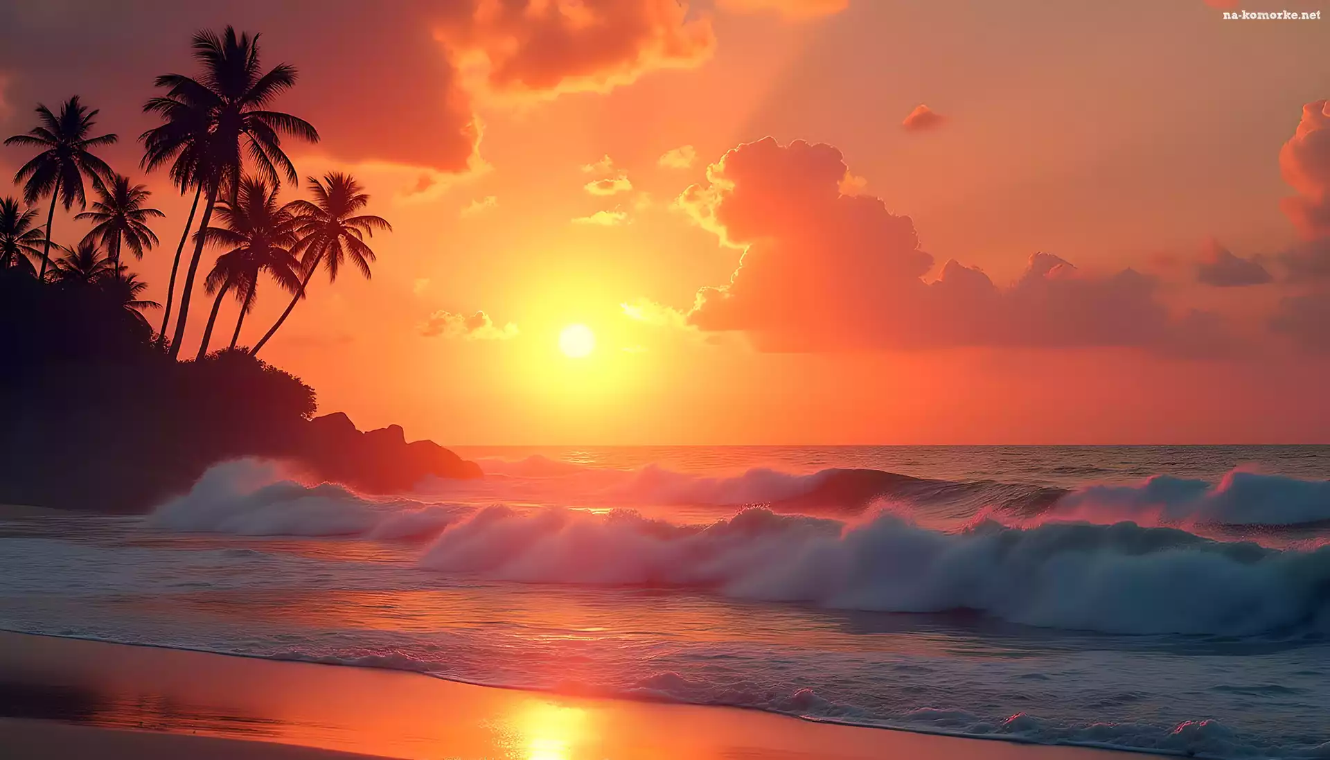 Fale, Morze, Niebo, Grafika, Zachód słońca, Palmy na Komórkę