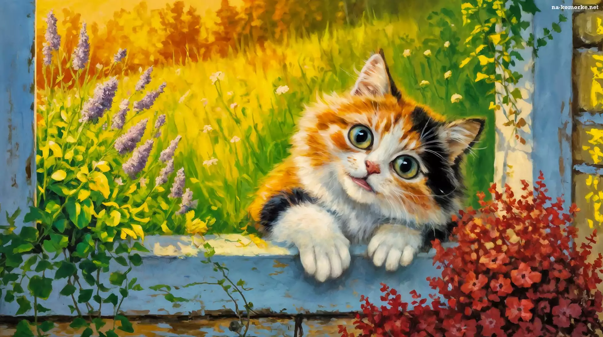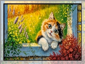 Łąka, Kot, Kwiaty, Grafika, Rama, Okno na Komórkę