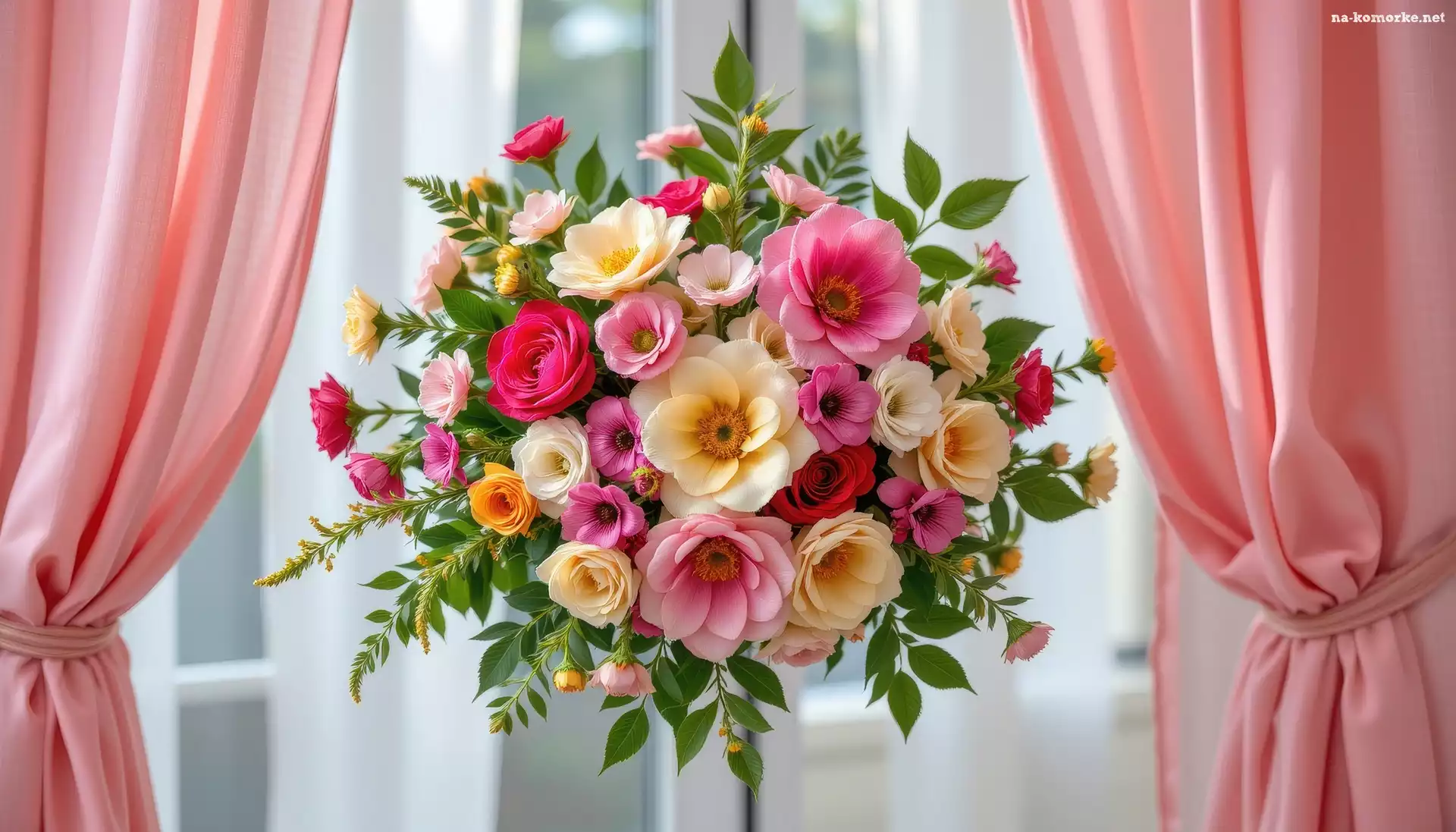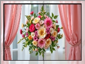 Zasłony, Wiszący, Okno, Grafika AI, Kwiaty, Bukiet na Komórkę