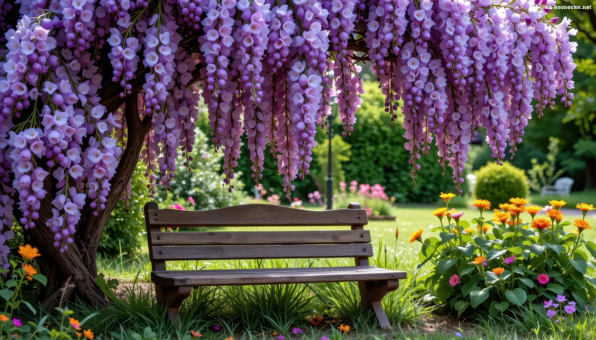 Drzewo, Fioletowe, Okwiecone, Grafika AI, Ławka, Kwiaty na Komórkę