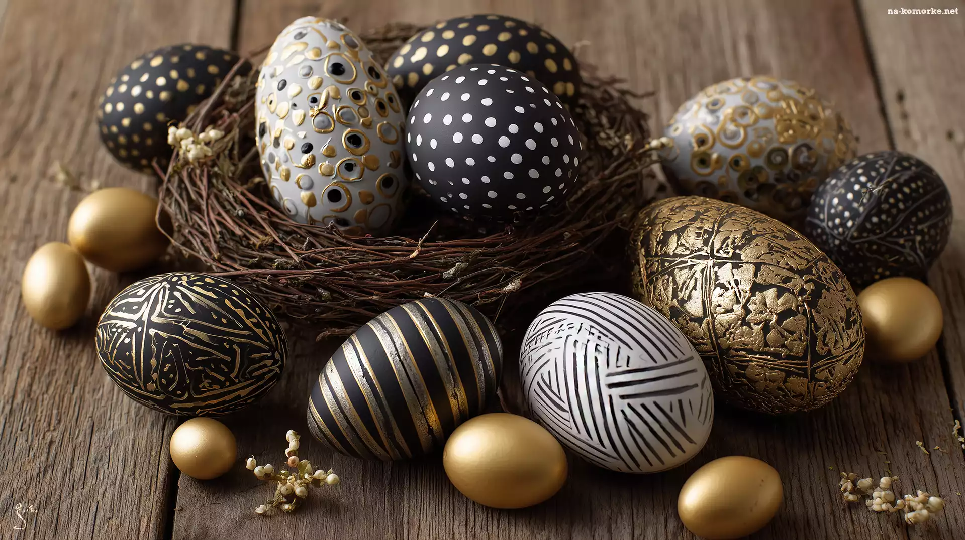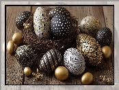 Gniazdko, Wielkanoc, Pisanki, Grafika AI, Czarne, Złote na Komórkę