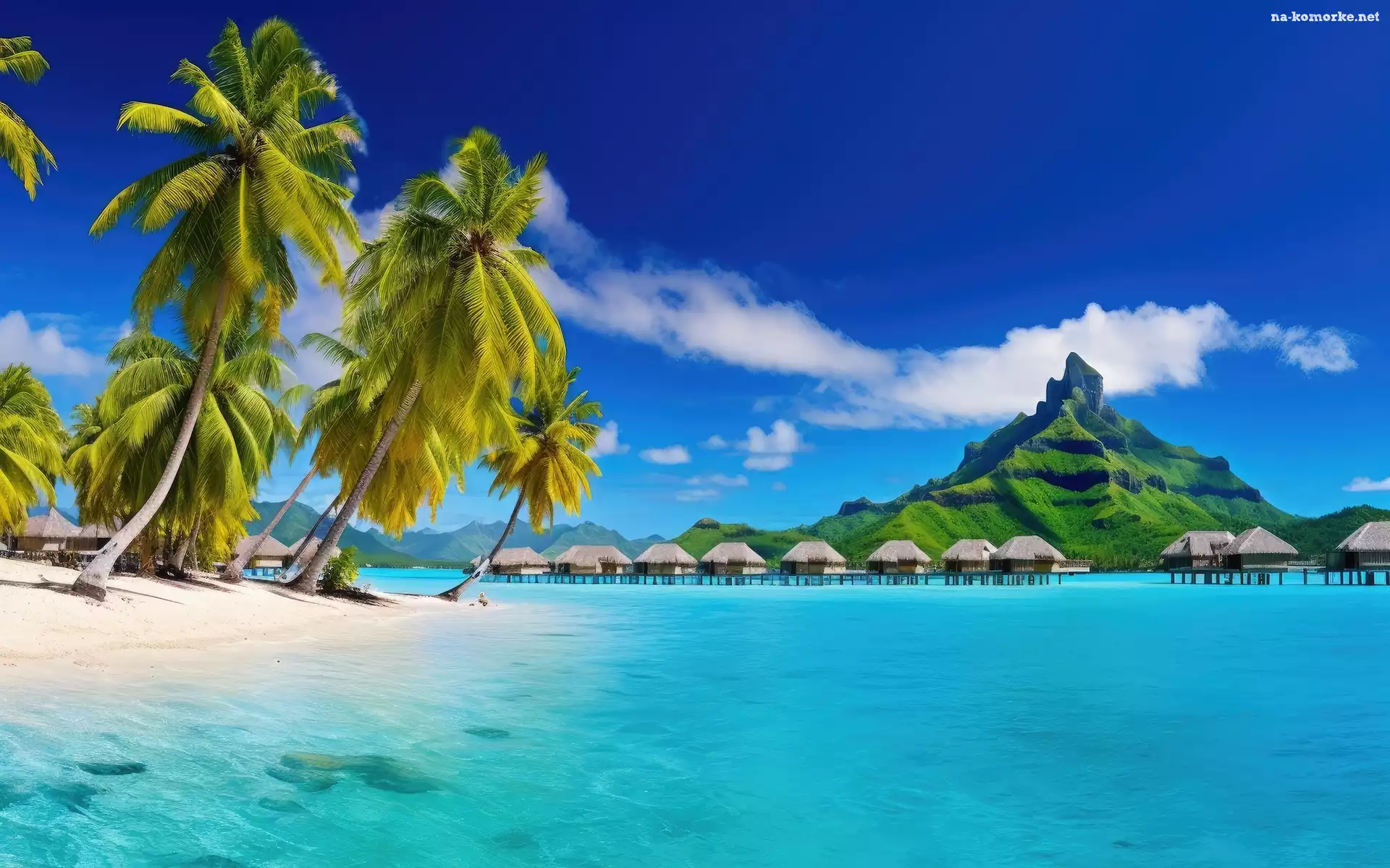 Góra, Morze, Domy, Grafika, Palmy, Plaża na Komórkę