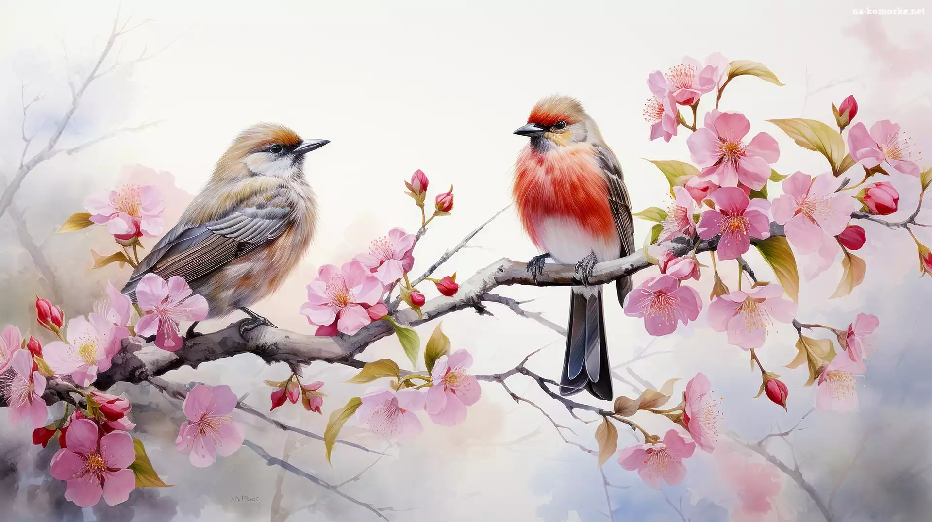 Wiosna, Kolorowe, Kwiaty, Grafika, Gałąź, Ptaki na Komórkę