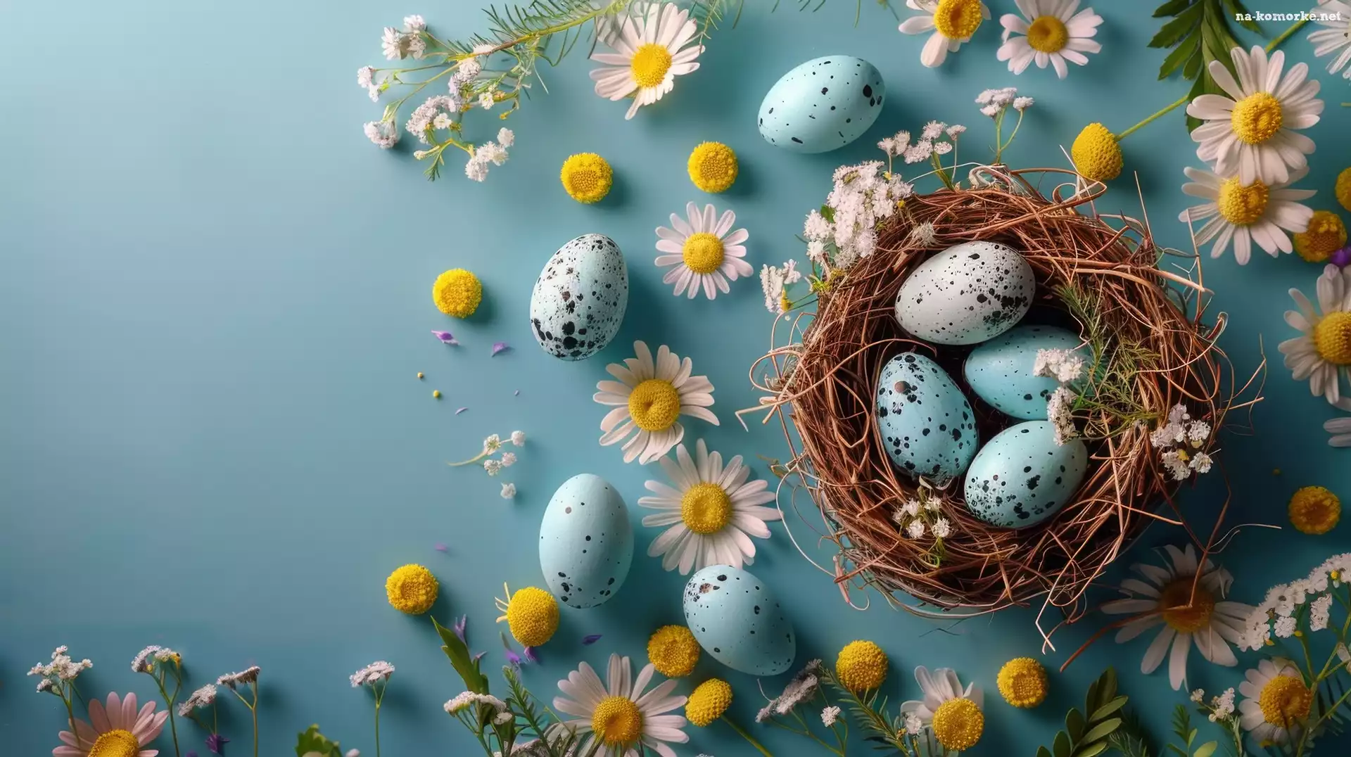 Kwiaty, Wielkanoc, Ptasie, Grafika, Niebieskie, Pisanki, Gniazdo na Komórkę