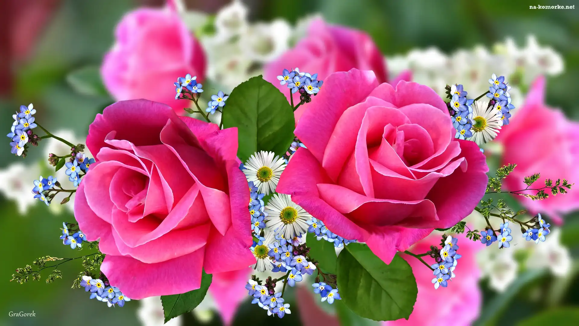 Grafika, Kwiaty, Różowe, Róże, Niezapominajki na Komórkę
