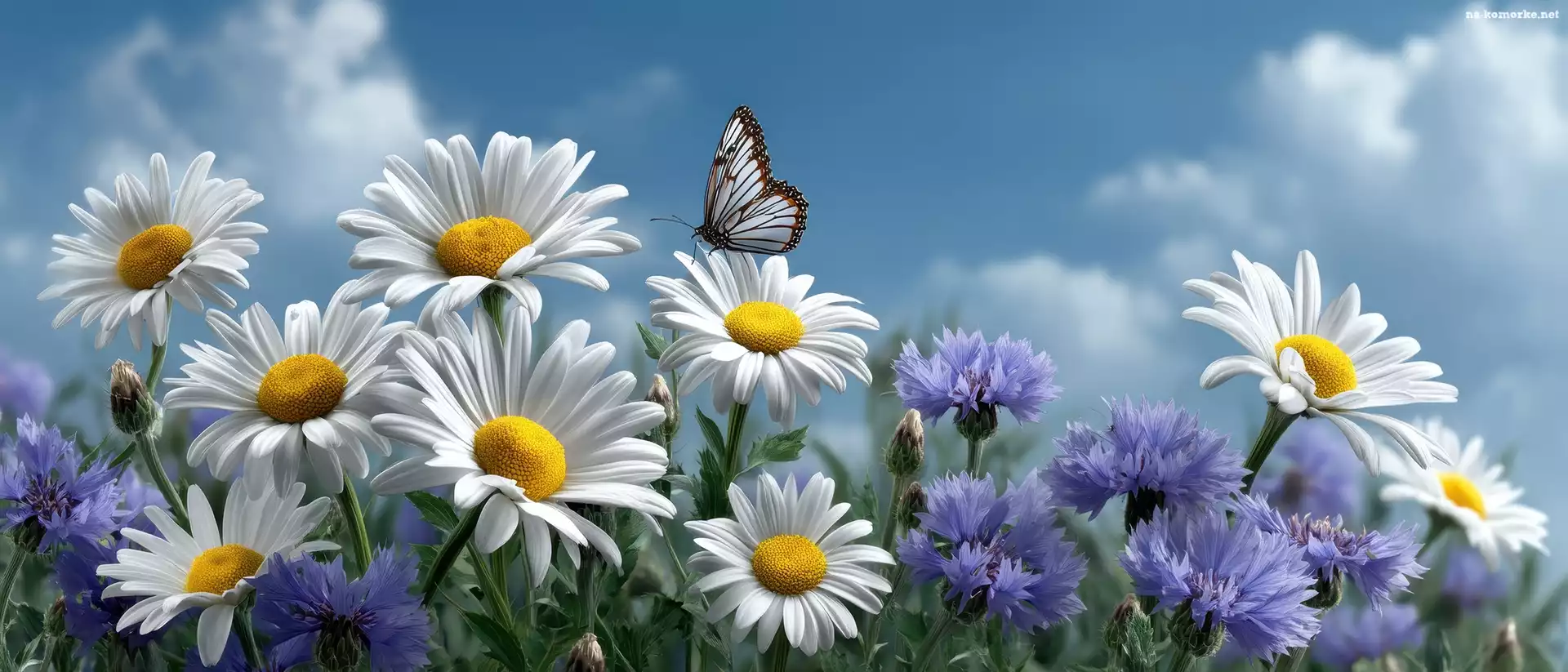Niebo, Kwiaty, Motyl, Grafika, Chaber, Rumianek na Komórkę