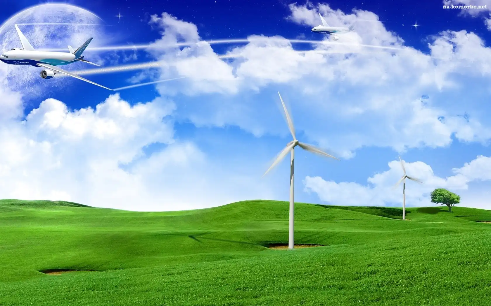Grafika, Łąki, Wiatraki, Samoloty, Chmury na Komórkę
