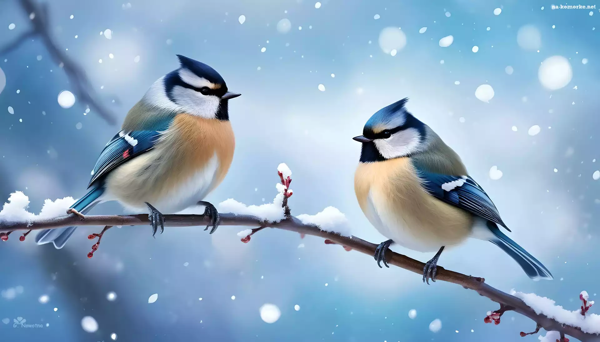 Zima, Dwie, Śnieg, Grafika, Gałązka, Sikorki na Komórkę