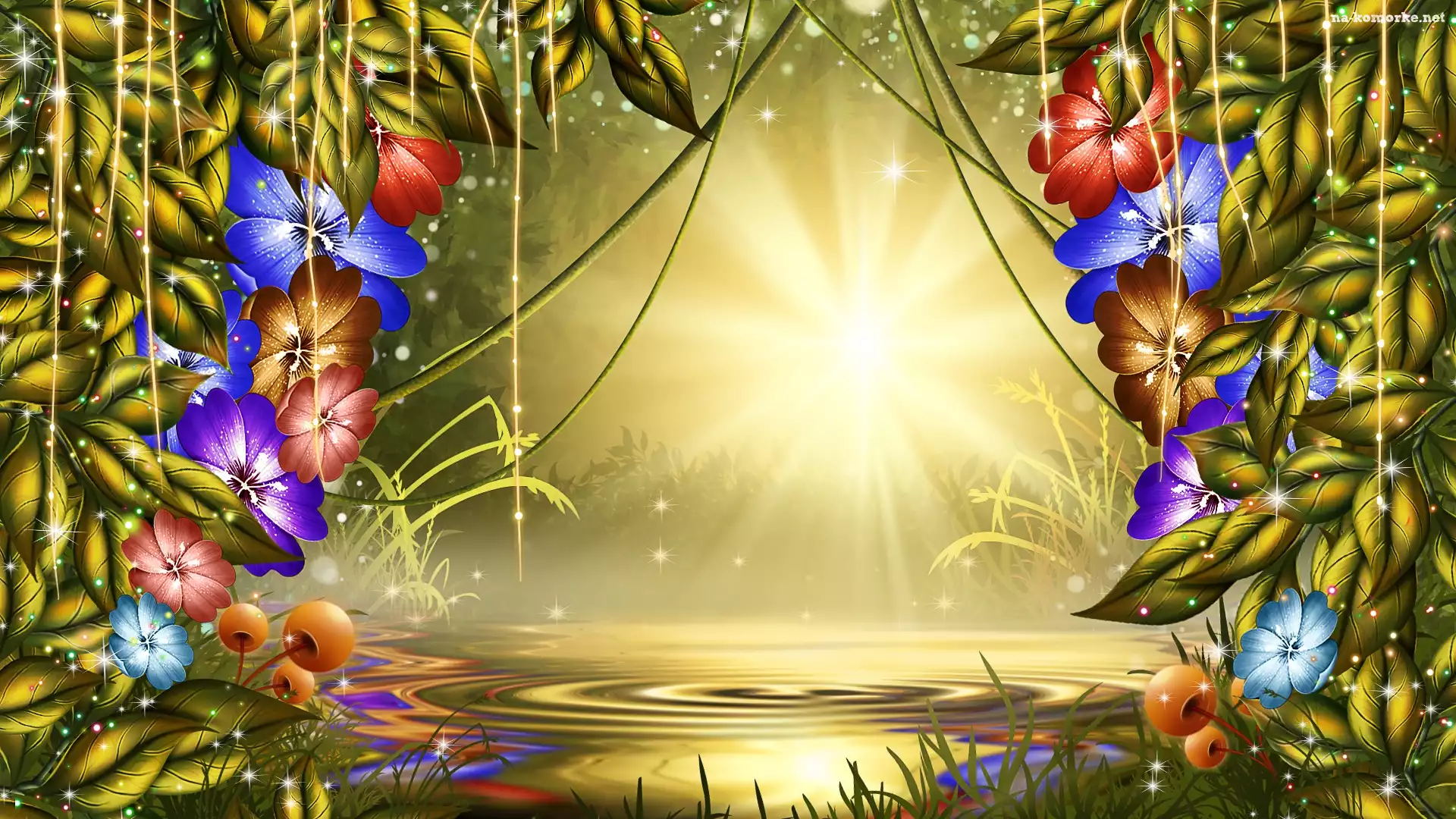 Grafika 2D, Staw, Promienie słońca, Kwiaty na Komórkę