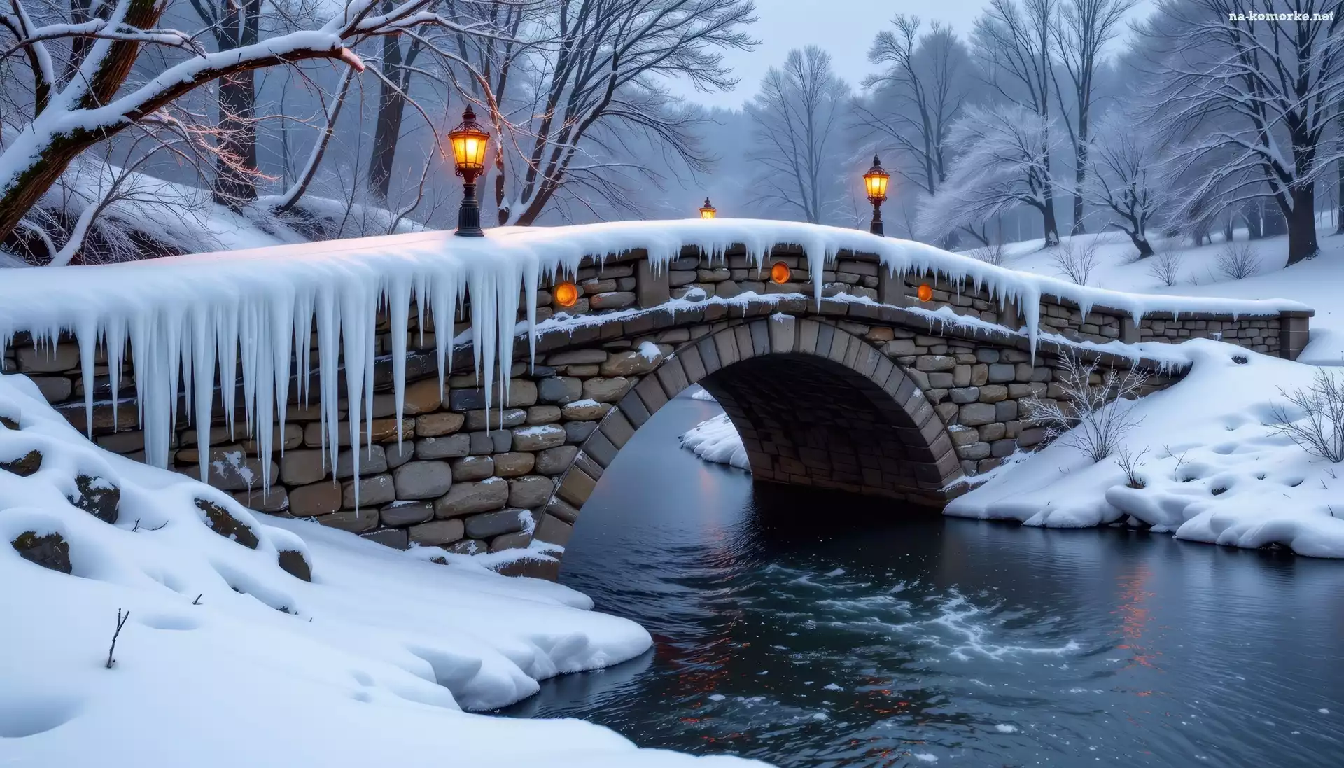Latarnie, Zima, Sople, Grafika AI, Most, Rzeka na Komórkę