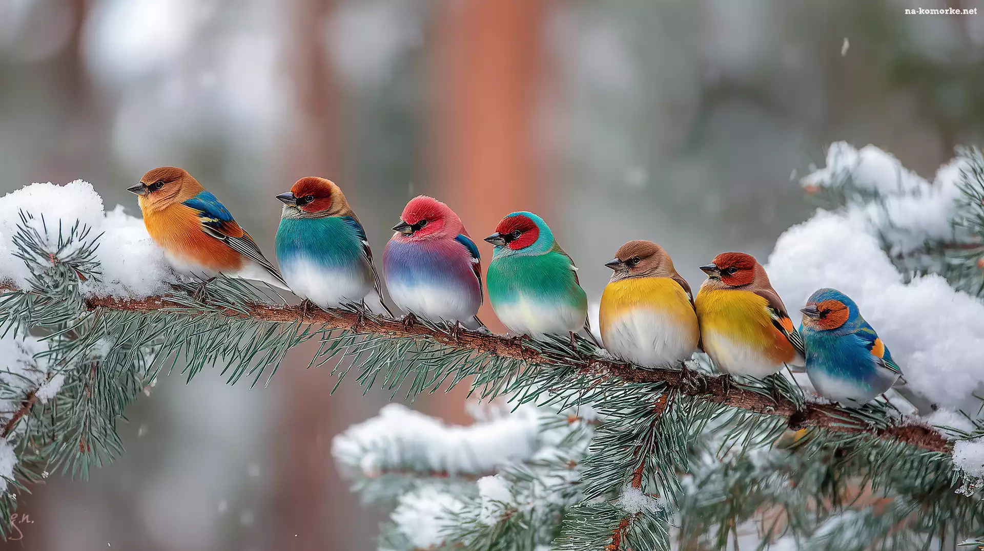 Śnieg, Kolorowe, Sosna, Grafika AI, Gałązka, Ptaki na Komórkę