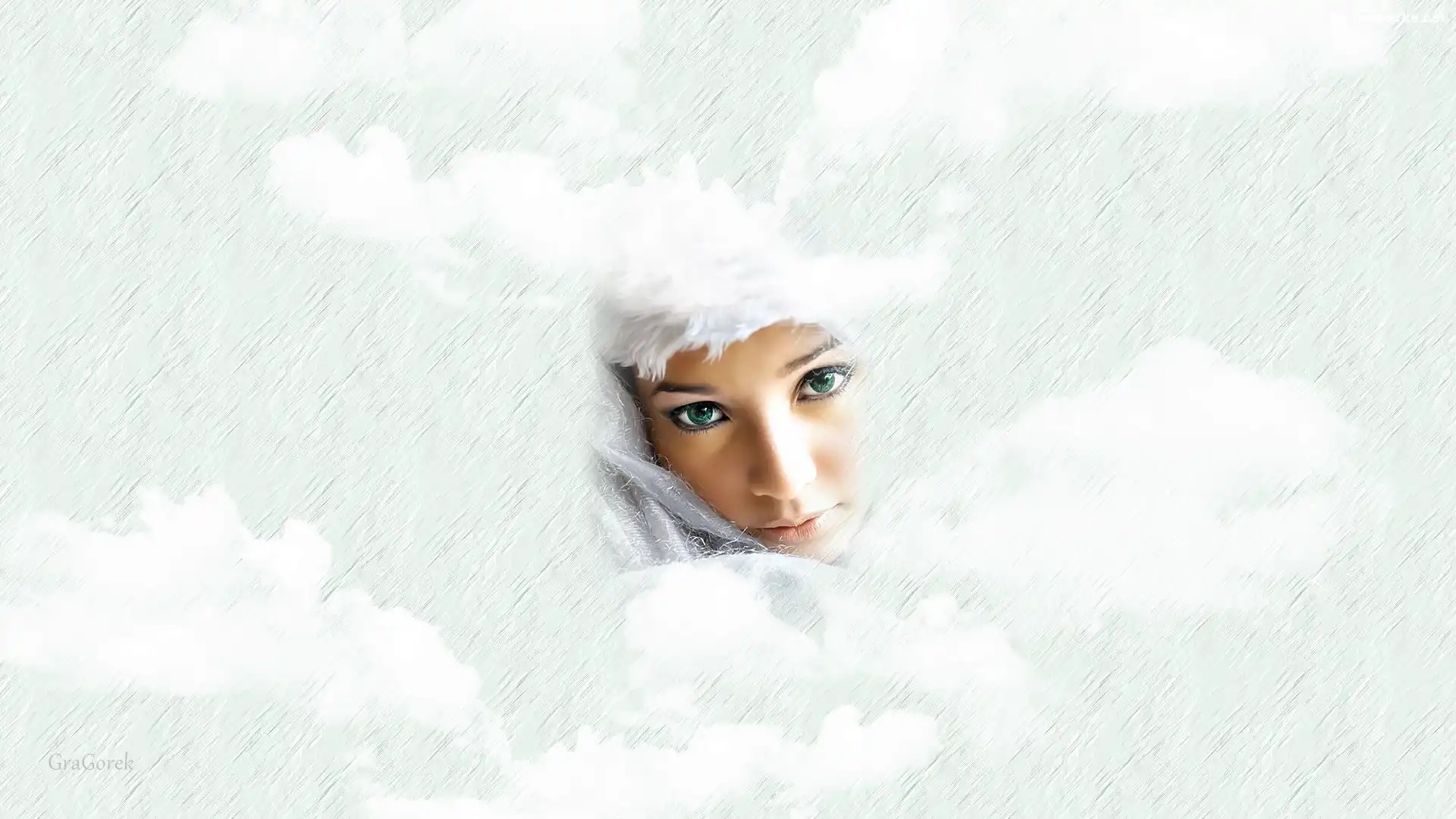 Grafika, Kobieta, Zielone oczy, Spojrzenie, Chmury na Komórkę