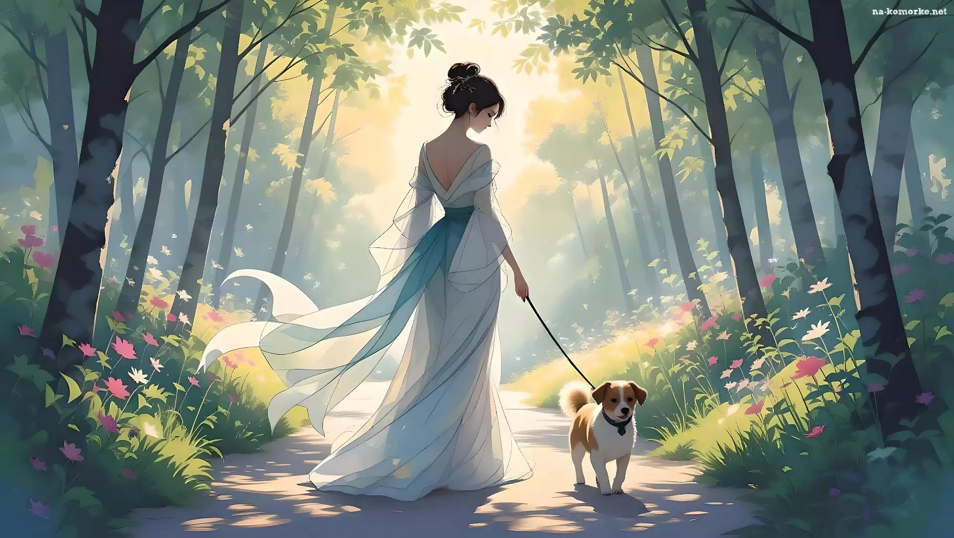 Drzewa, Kobieta, Ścieżka, Grafika, Pies, Suknia na Komórkę