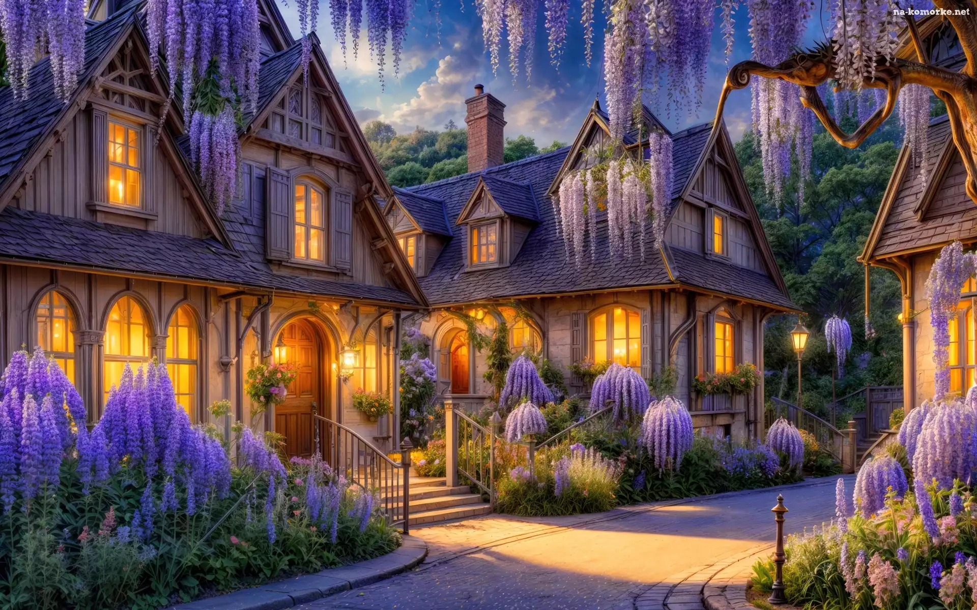 Droga, Domy, Glicynia, Grafika, Kwiaty, Światła na Komórkę
