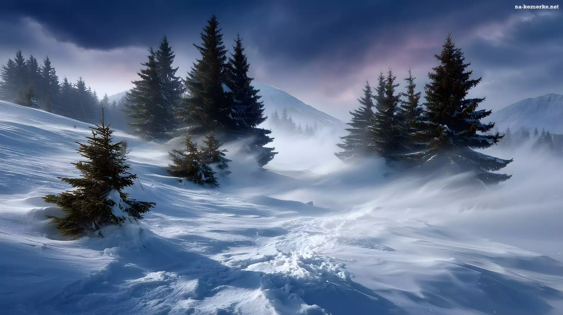 Zamieć, Zima, Świerki, Grafika AI, Drzewa, Zbocze na Komórkę