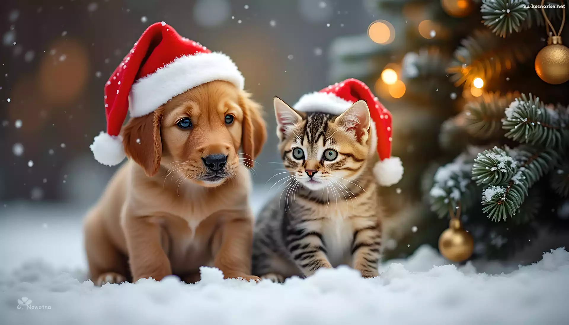 Choinka, Śnieg, Szczeniak, Grafika, Czapki, Mikołaja, Kot na Komórkę