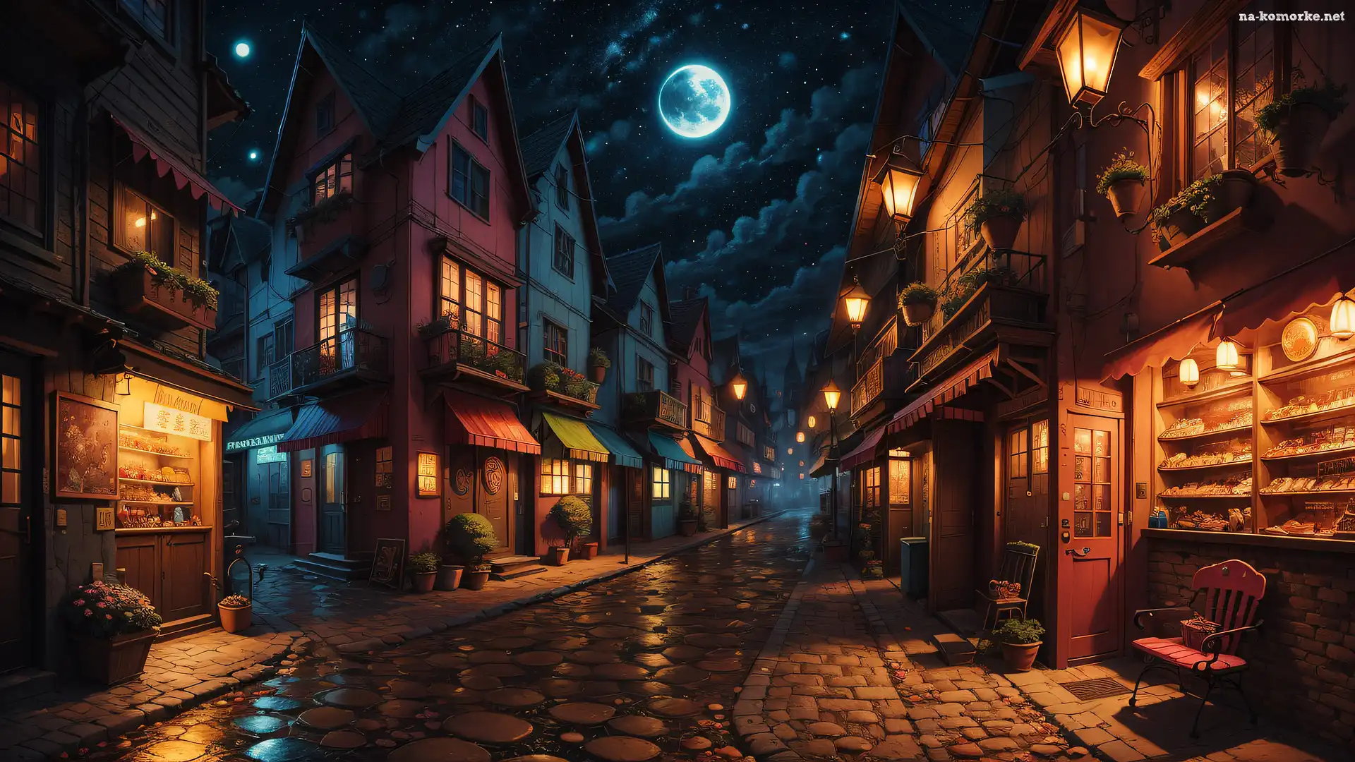 Księżyc, Domy, Noc, Grafika, Miasteczko, Ulica na Komórkę