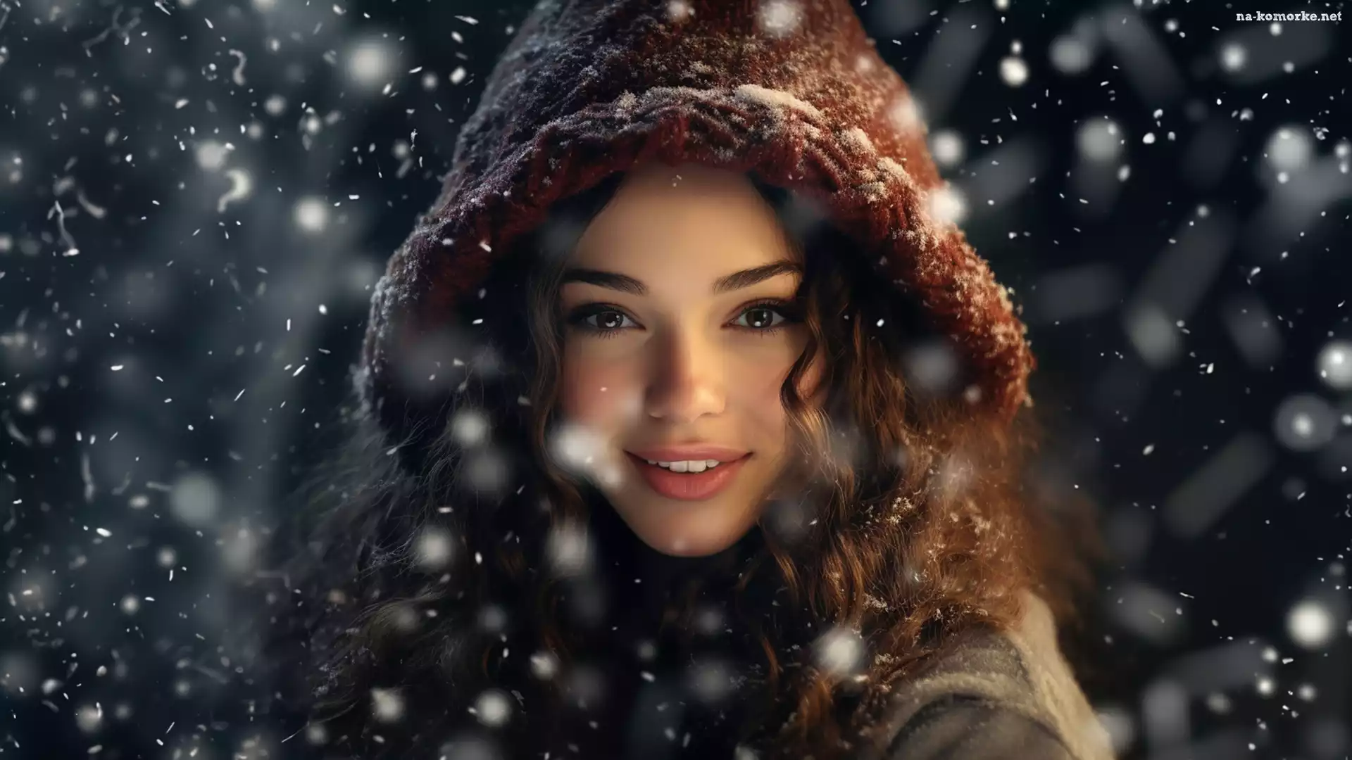 Grafika, Śnieg, Długowłosa, Zima, Brunetka, Dziewczyna, Czapka, Kurtka, Uśmiech, 2D na Komórkę |