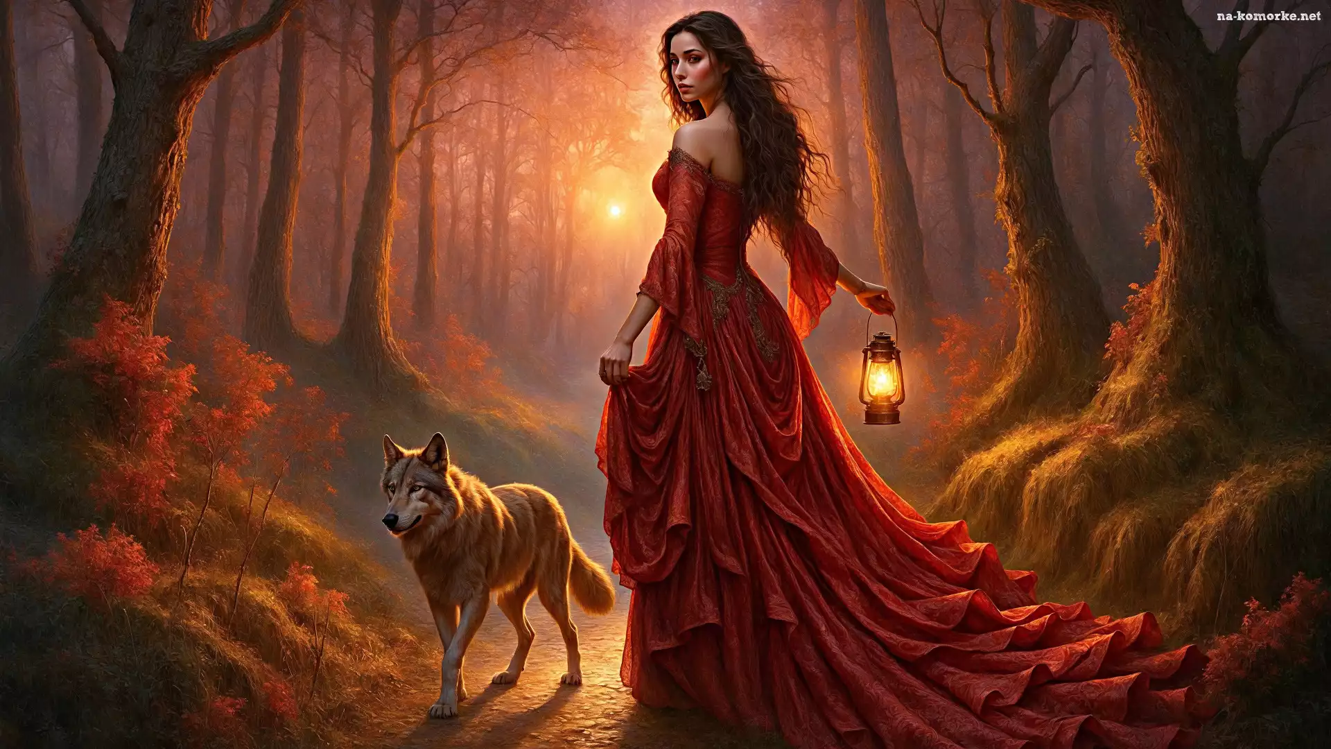Latarnia, Las, Wilk, Grafika, Czerwona, Suknia, Kobieta na Komórkę