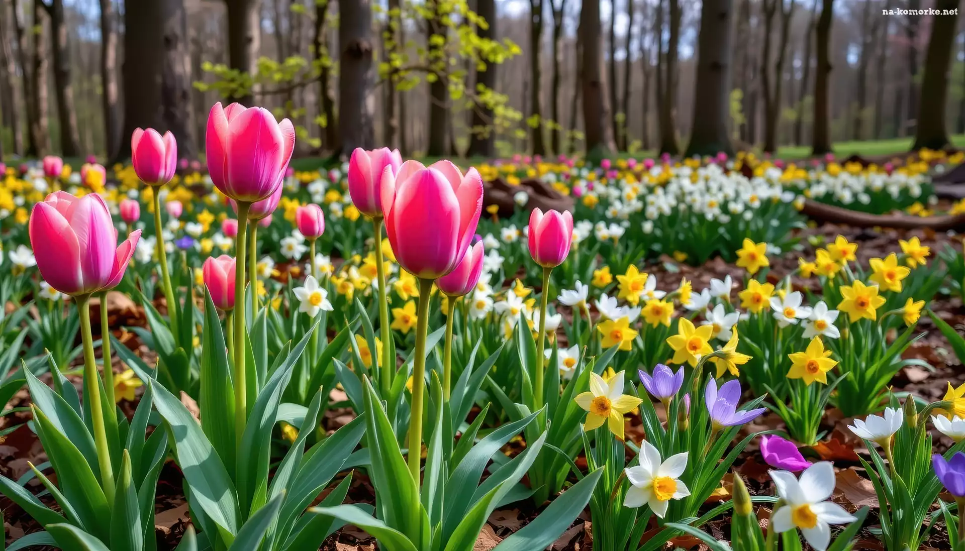 Las, Tulipany, Wiosna, Grafika AI, Kwiaty, Żonkile na Komórkę