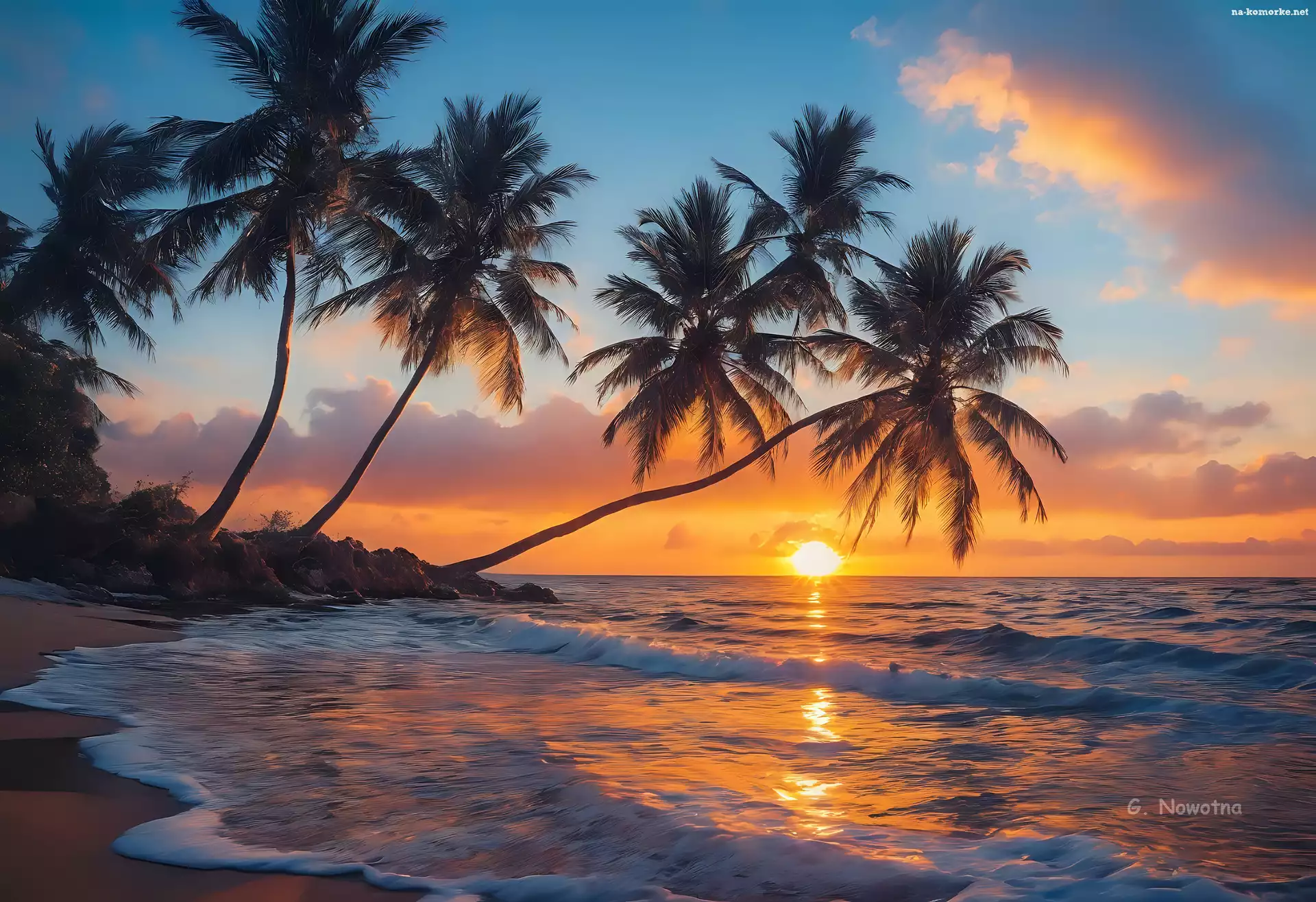 Morze, Grafika, Zachód Słońca, Palmy na Komórkę