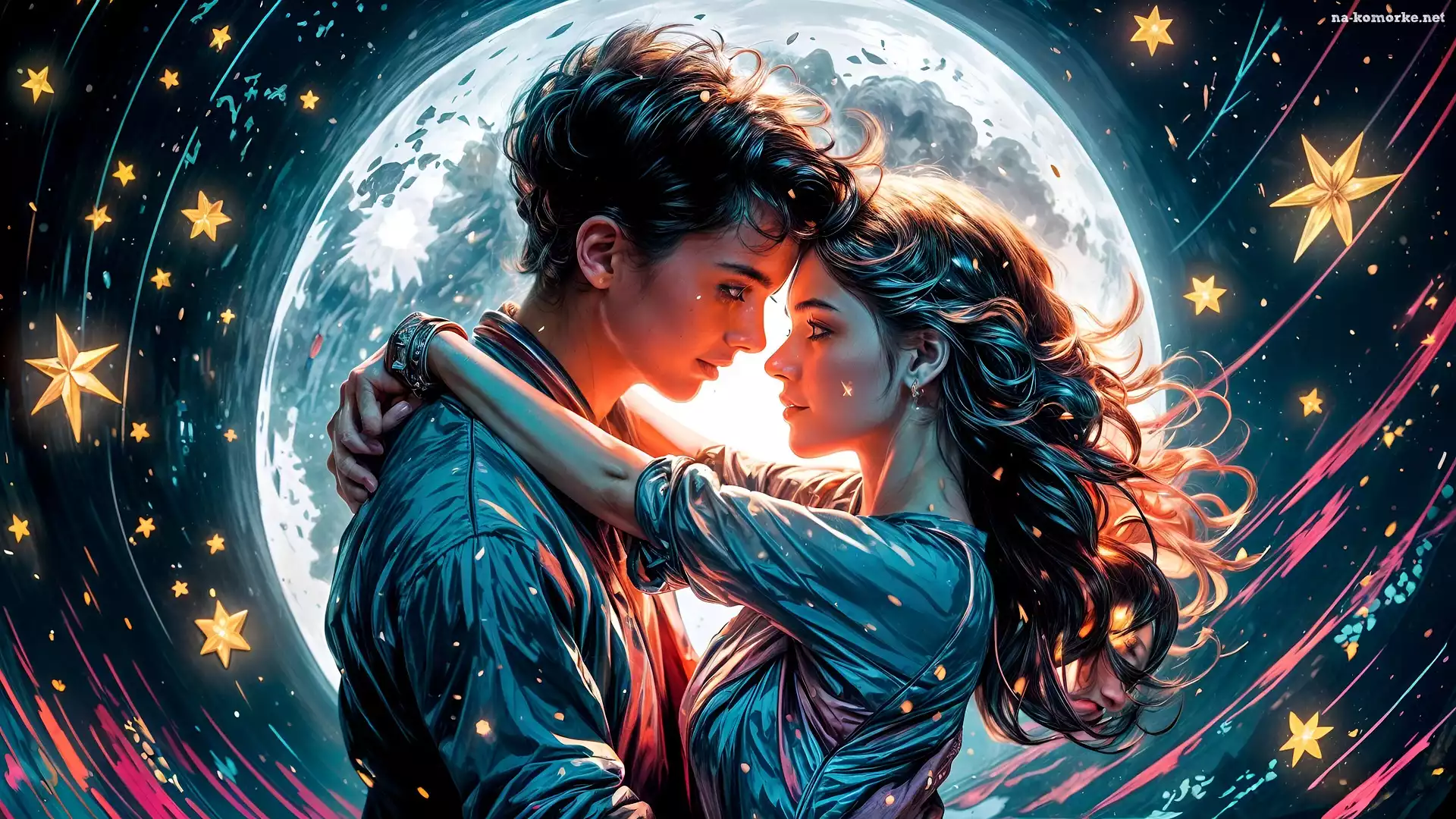 Kobieta, Mężczyzna, Zakochani, Grafika, Gwiazdy, Niebo, Księżyc na Komórkę