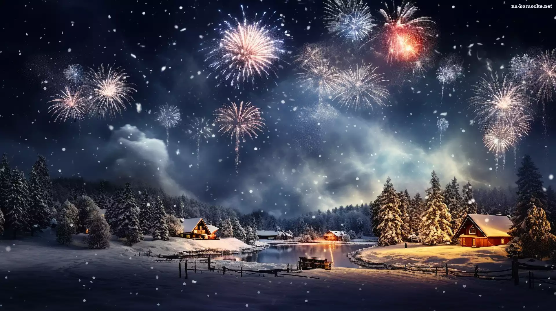Fajerwerki, Drzewa, Zima, Grafika, Rzeka, Sylwester, Domy na Komórkę