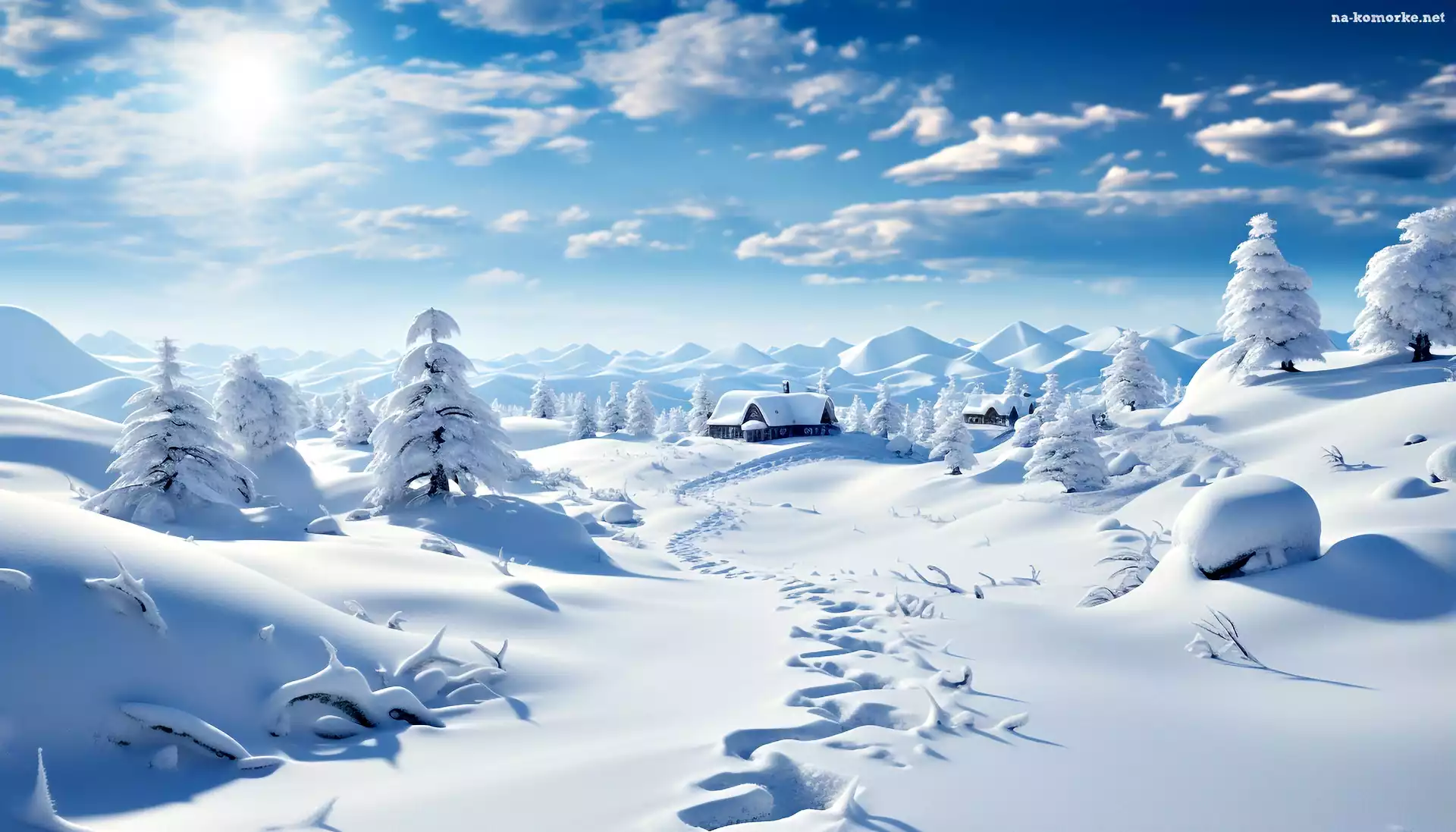 Poranek, Słońce, Zima, Grafika, Śnieg, Domy, Ślady na Komórkę