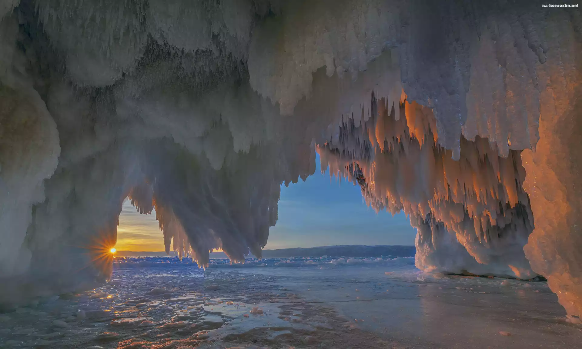 Zima, Obwód irkucki, Sople, Rosja, Grota, Jezioro Bajkał, Promienie słońca, Wyspa Kharantsy na Komórkę |
