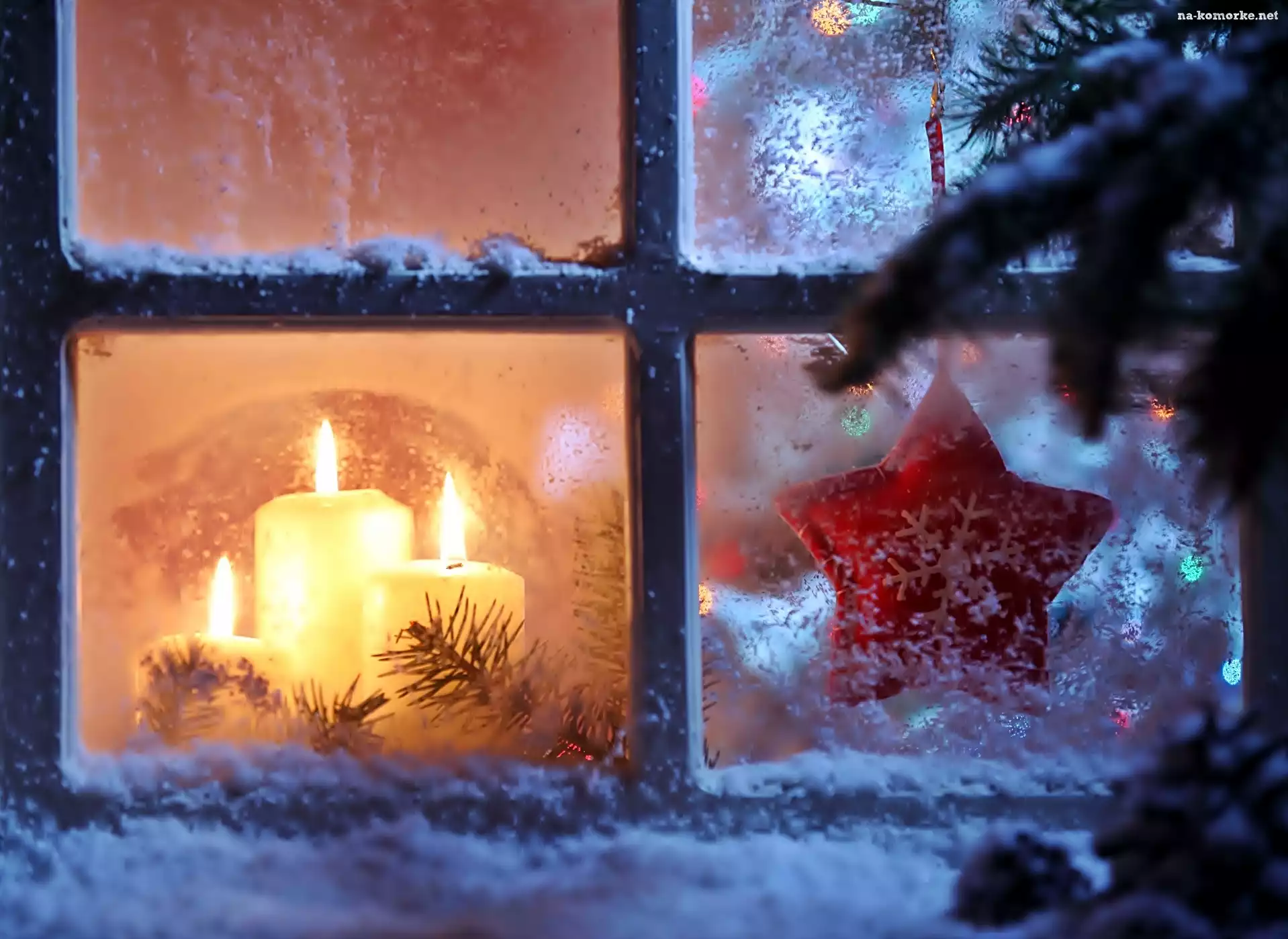 Okno, Gwiazdka, Świerk Dekoracja, Płonące, Białe, Świeczki, Czerwona na Komórkę