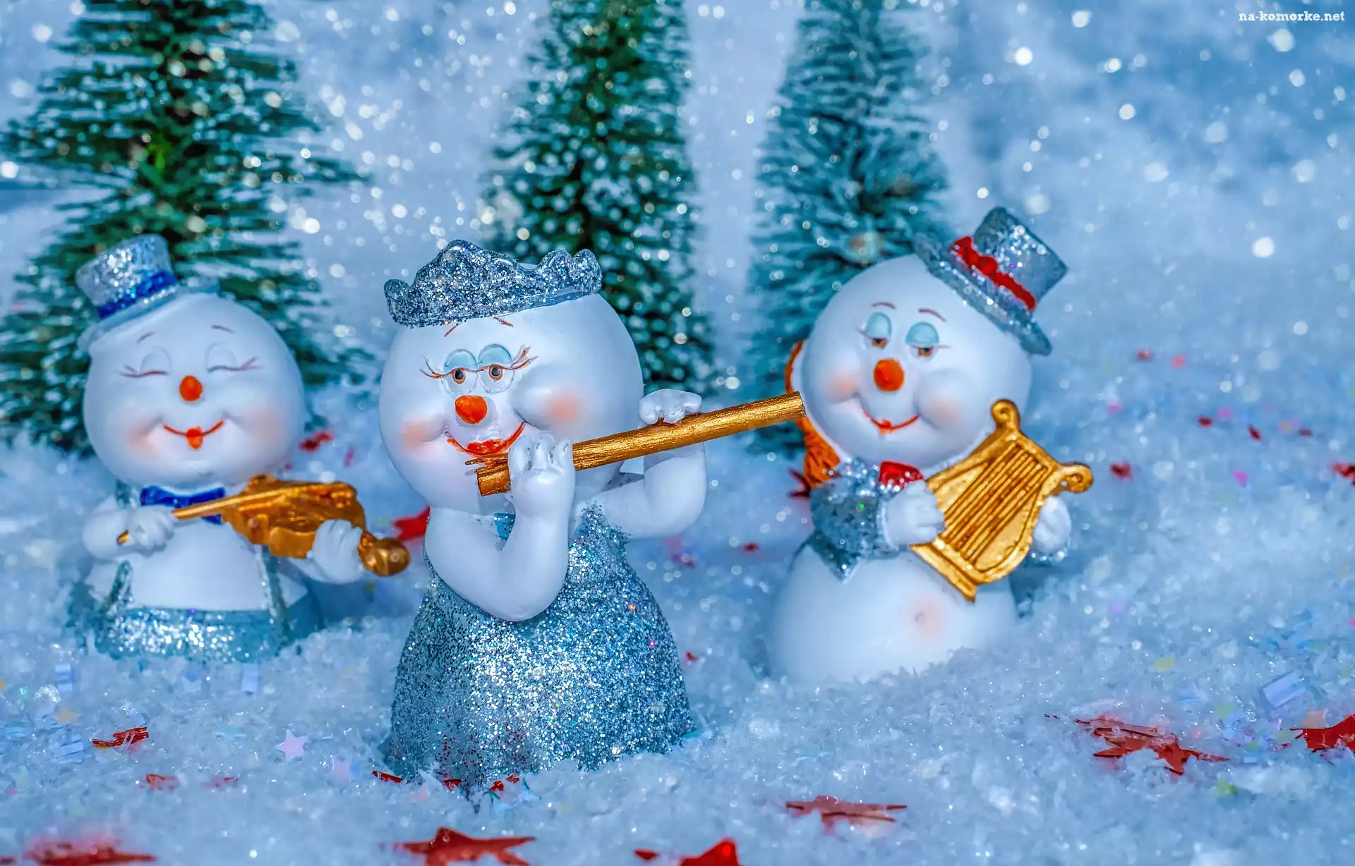 Figurki, Gwiazdki, Bałwanki, Świąteczne, Trzy, Instrumenty, Choinki, Śnieg na Komórkę