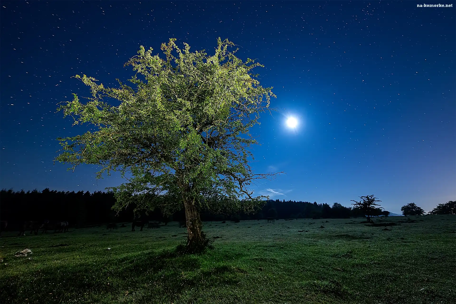 Łąka, Noc, Księżyc, Gwiazdy, Drzewo na Komórkę
