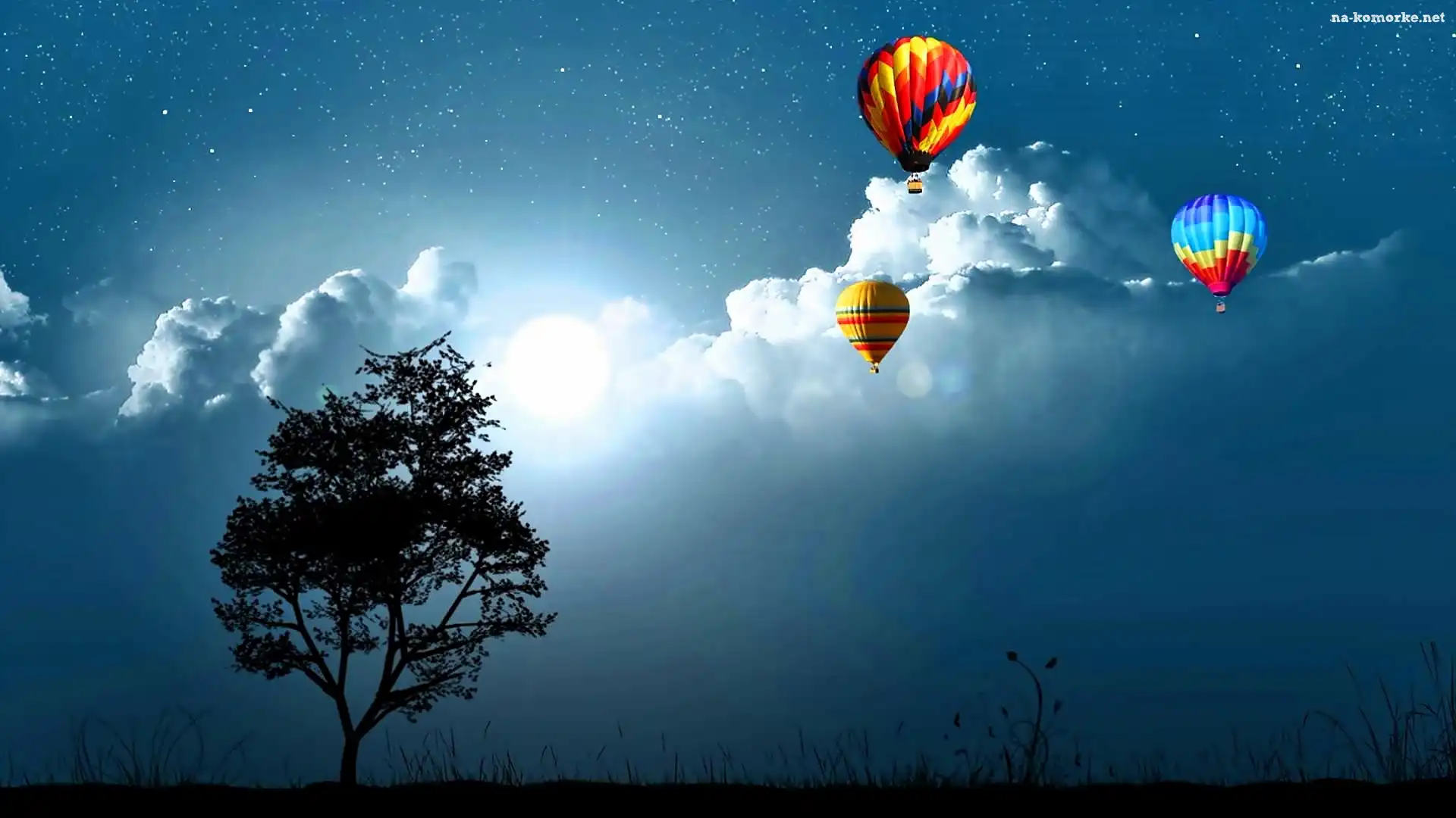 Noc, Gwiazdy, Balony, Mgła, Drzewo, Obłoki, Księżyc na Komórkę