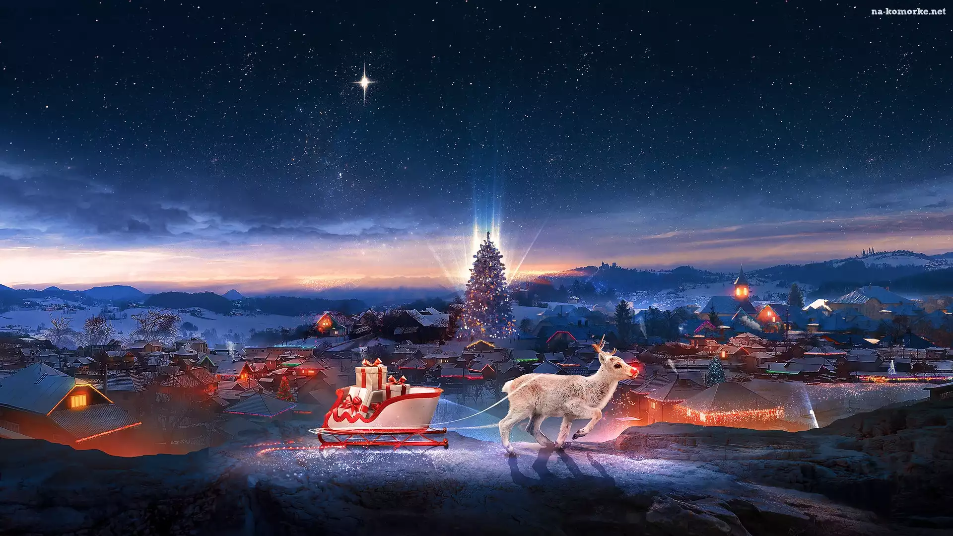 Grafika, Domy, Zaprzęg, Renifer, Boże Narodzenie, Mikołaj, Prezenty, Gwiazdy na Komórkę