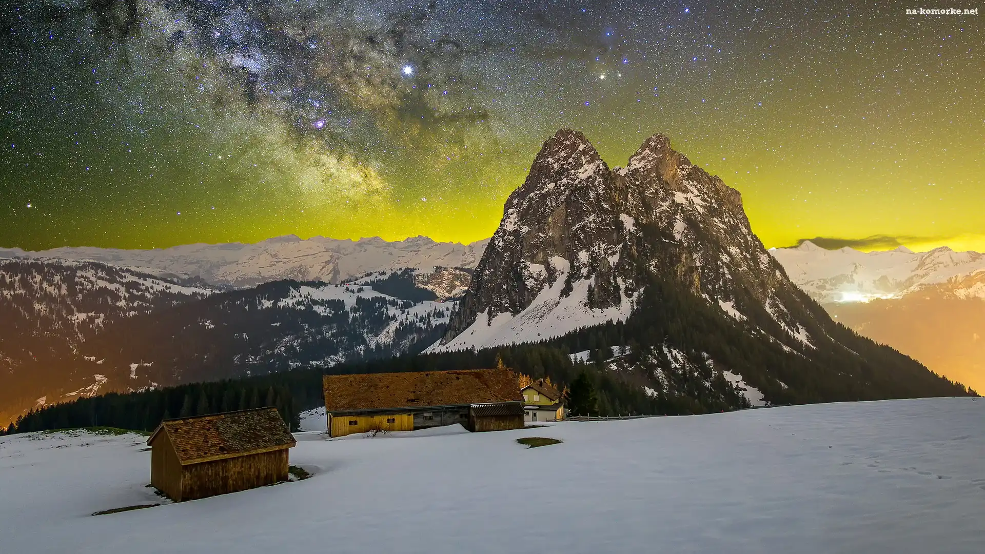 Haggenegg, Góry, Szwajcaria, Szopy, Zima, Droga Mleczna, Domy, Alpy, Góra Kleiner Mythen, Galaktyka na Komórkę |