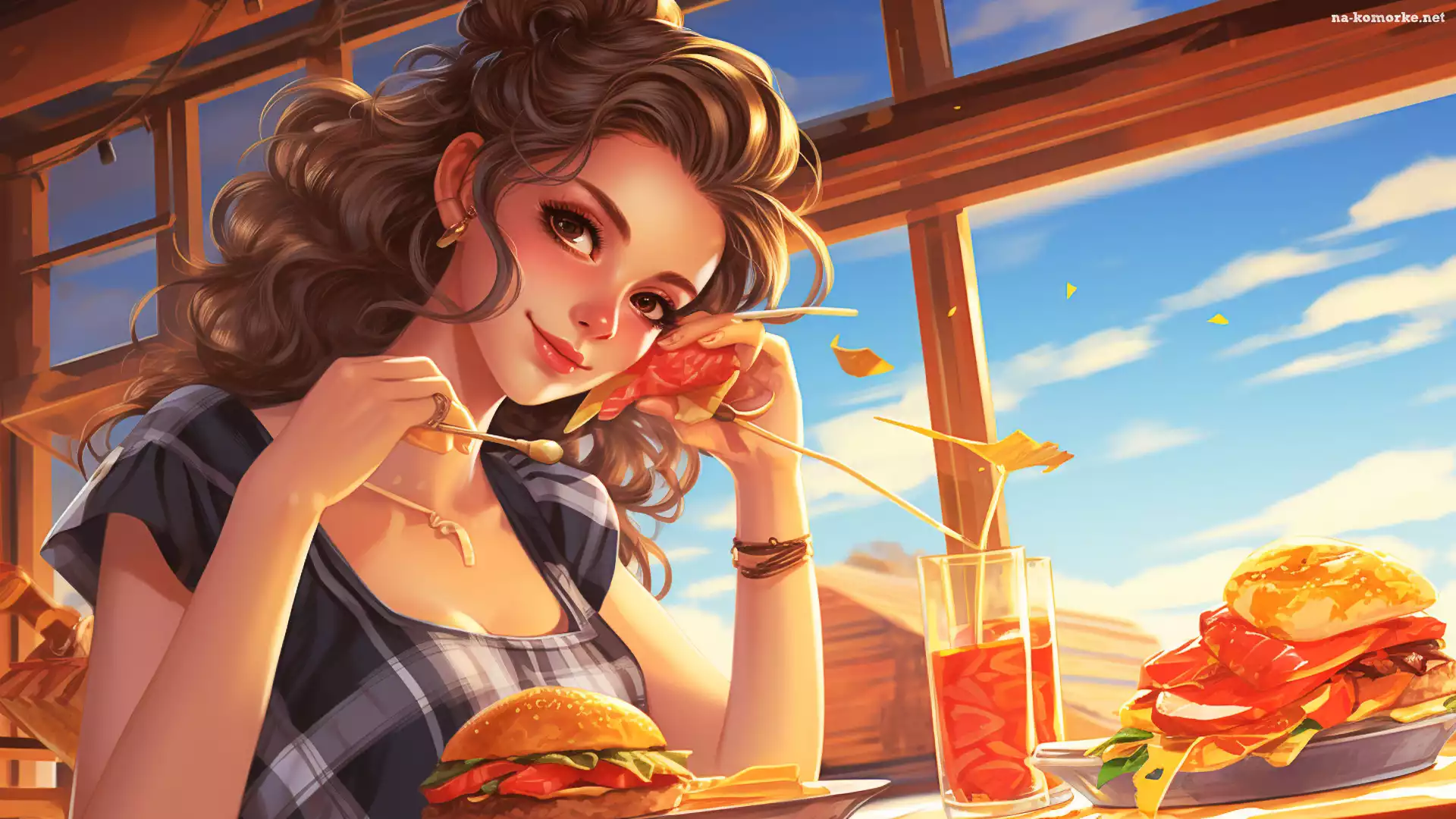 Drink, Dziewczyna, Pomarańczowy, Hamburger, Lunch, Sukienka na Komórkę