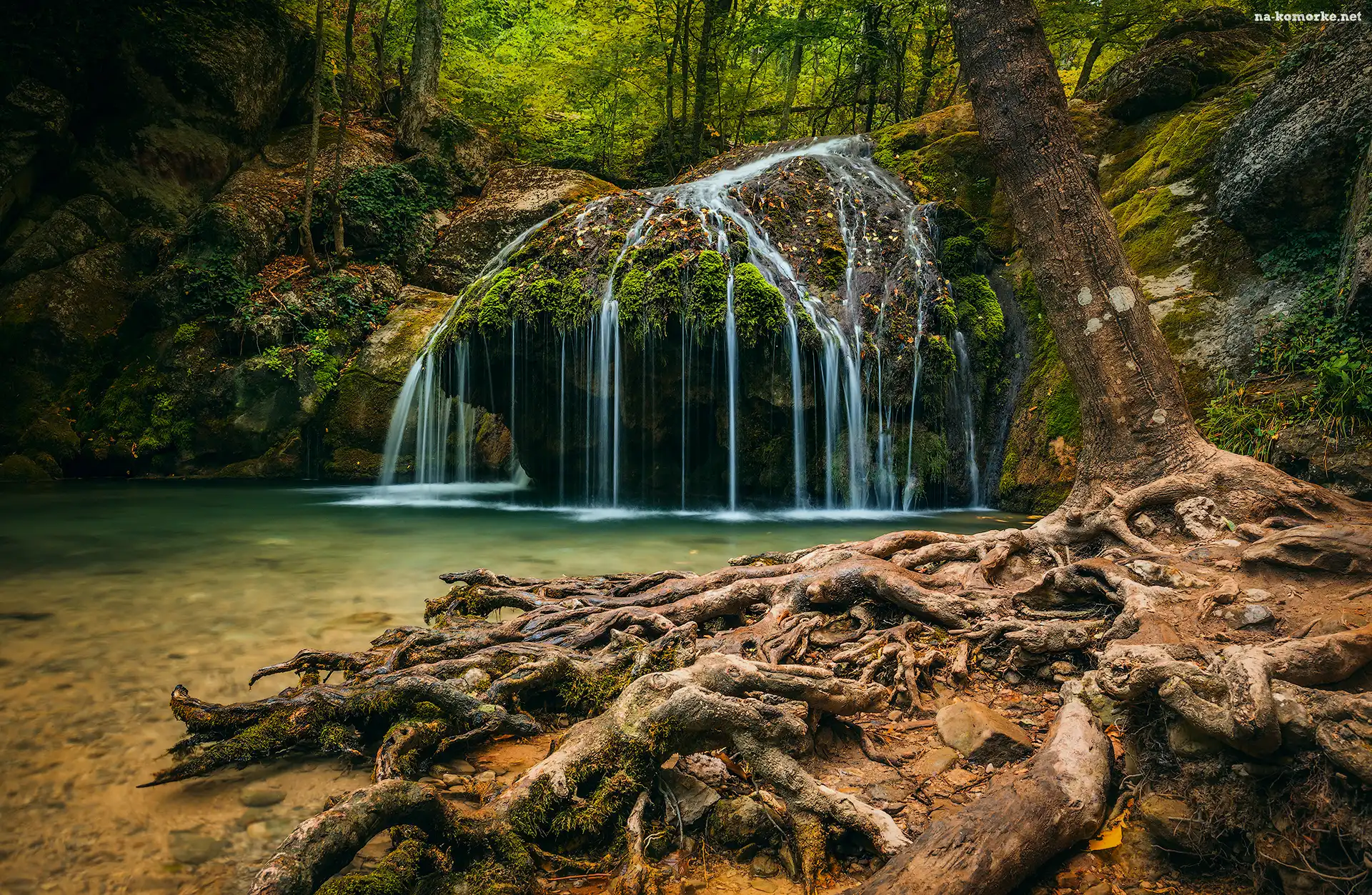 Wodospad, Krym, Rosja, Rzeka Ulu-Uzen, Las, Drzewa, Wąwóz Haphal na Komórkę