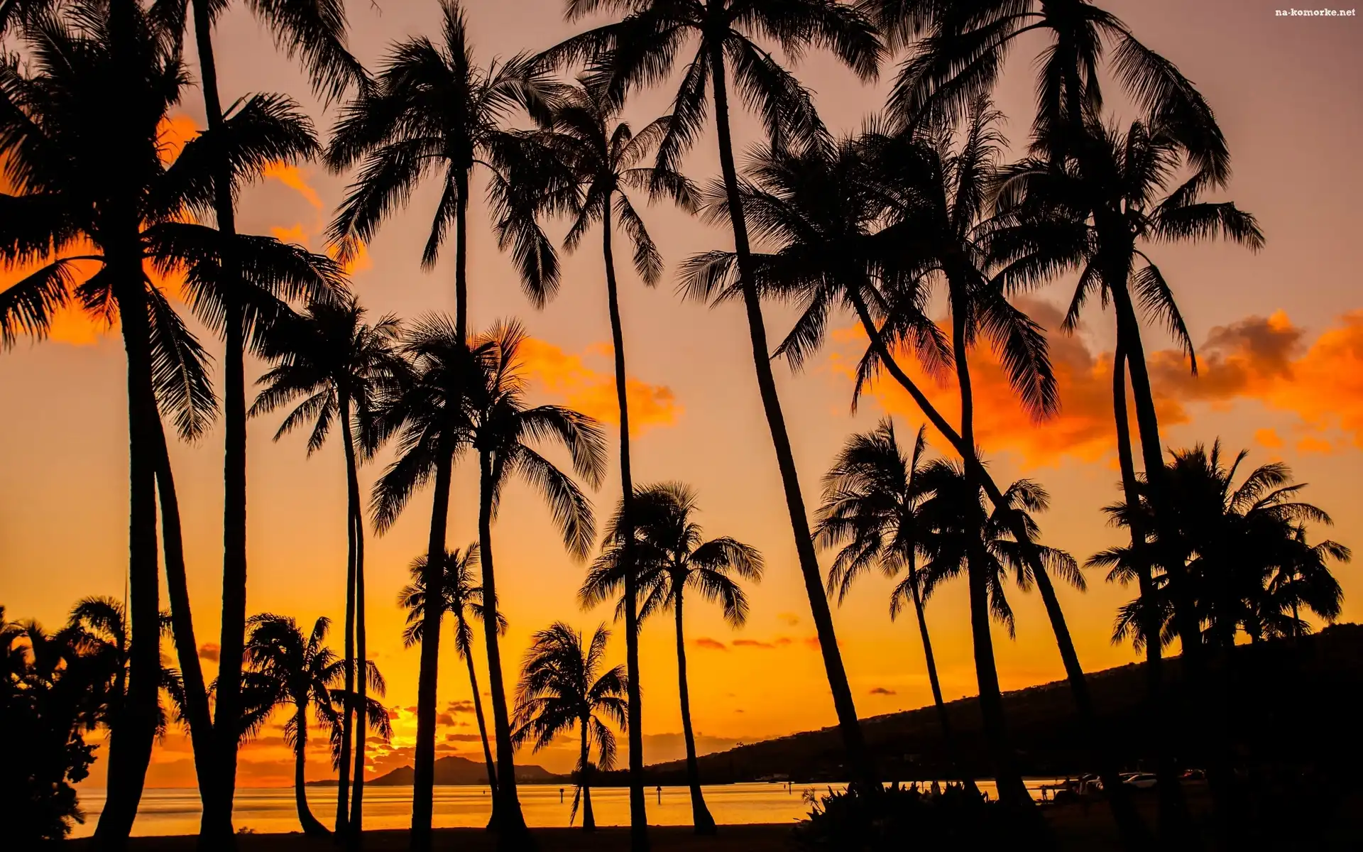 Palmy, Hawaje, USA, Ocean, Zachód, Słońca, Wyspa na Komórkę