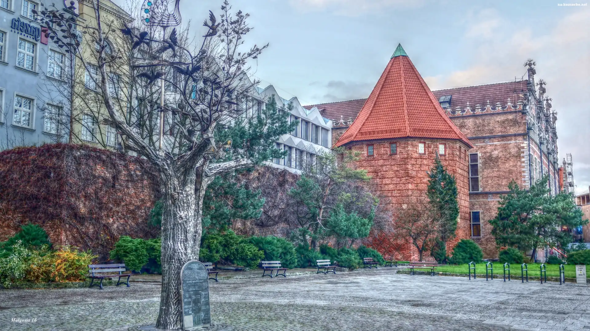 HDR, Gdańsk, Budynki, Drzewo, Tabliczka na Komórkę